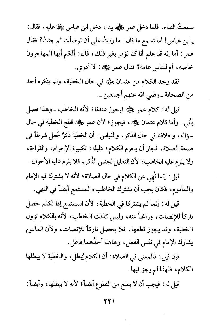 قيل له: كلام عمر - رضي الله عنه - فيجوز عندنا؛ لأنه الخاطب - وهذا فصل يأتي - وأما كلام عثمان - رضي الله عنه -، فيجوز؛ لأن عمر - رضي الله عنه - قطع الخطبة في حال سؤاله، وخلافنا في حال الذكر، والقياس: أن الخطبة ذكرٌ جُعل شرطًا في صحة الصلاة، فجاز أن يحرم الكلام؛ دليله: تكبيرة الإحرام، والقراءة، ولا يلزم عليه الخاطب؛ لأن التعليل لجنس الذَّكر، فلا يلزم عليه الأحوال.