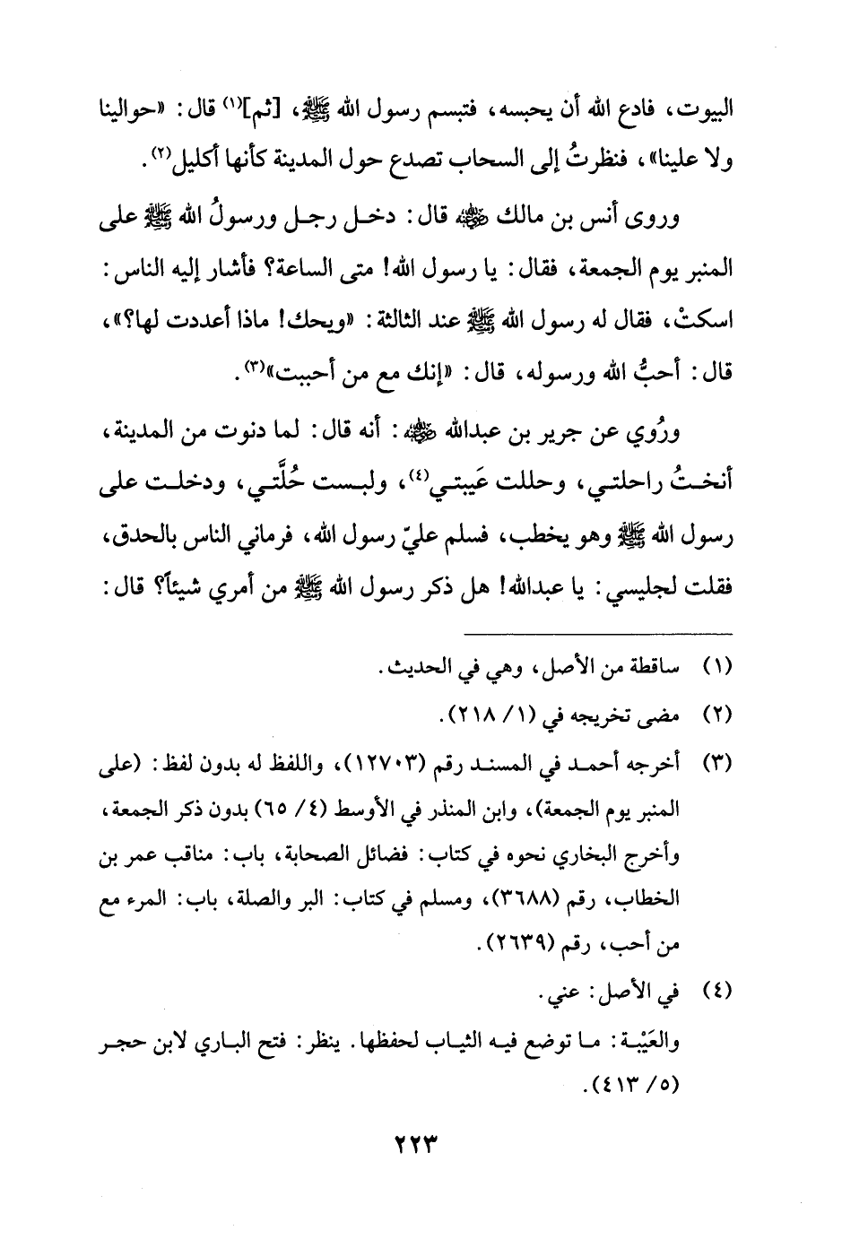 (¬3) أخرجه أحمد في المسند رقم (12703)، واللفظ له بدون لفظ: (على المنبر يوم الجمعة)، وابن المنذر في الأوسط (4/ 65) بدون ذكر الجمعة، وأخرج البخاري نحوه في كتاب: فضائل الصحابة، باب: مناقب عمر بن الخطاب، رقم (3688)، ومسلم في كتاب: البر والصلة، باب: المرء مع من أحب، رقم (2639).