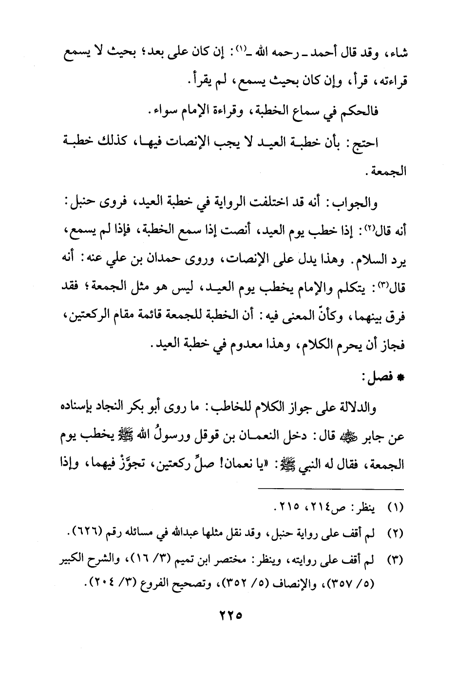 والجواب: أنه قد اختلفت الرواية في خطبة العيد، فروى حنبل: أنه قال (¬2): إذا خطب يوم العيد، أنصت إذا سمع الخطبة، فإذا لم يسمع، يرد السلام. وهذا يدل على الإنصات، وروى حمدان بن علي عنه: أنه قال (¬3): يتكلم والإمام يخطب يوم العيد، ليس هو مثل الجمعة؛ فقد فرق بينهما، وكأنّ المعنى فيه: أن الخطبة للجمعة قائمة مقام الركعتين، فجاز أن يحرم الكلام، وهذا معدوم في خطبة العيد.