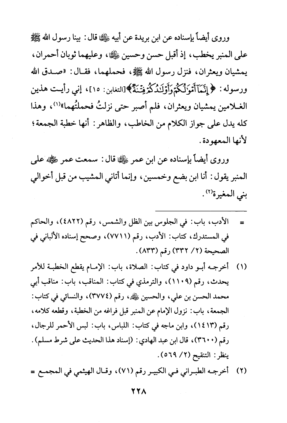 (¬1) أخرجه أبو داود في كتاب: الصلاة، باب: الإمام يقطع الخطبة للأمر يحدث، رقم (1109)، والترمذي في كتاب: المناقب، باب: مناقب أبي محمد الحسن بن علي، والحسين - رضي الله عنهما -، رقم (3774)، والنسائي في كتاب: الجمعة، باب: نزول الإمام عن المنبر قبل فراغه من الخطبة، وقطعه كلامه، رقم (1413)، وابن ماجه في كتاب: اللباس، باب: لبس الأحمر للرجال، رقم (3600)، قال ابن عبد الهادي: (إسناد هذا الحديث على شرط مسلم). ينظر: التنقيح (2/ 569).