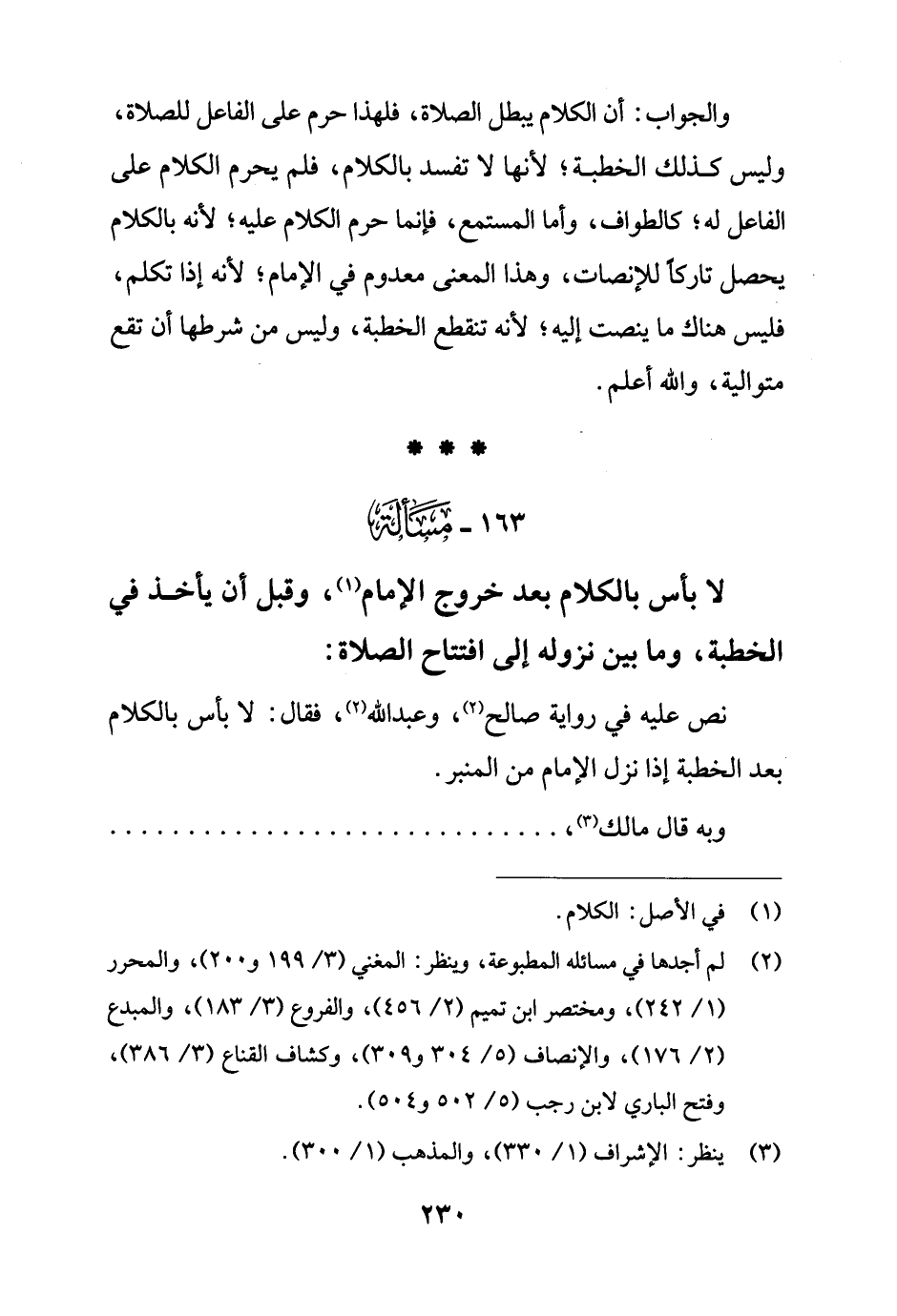 163 - مَسْألَة: لا بأس بالكلام بعد خروج الإمام (¬1)، وقبل أن يأخذ في الخطبة، وما بين نزوله إلى افتتاح الصلاة: