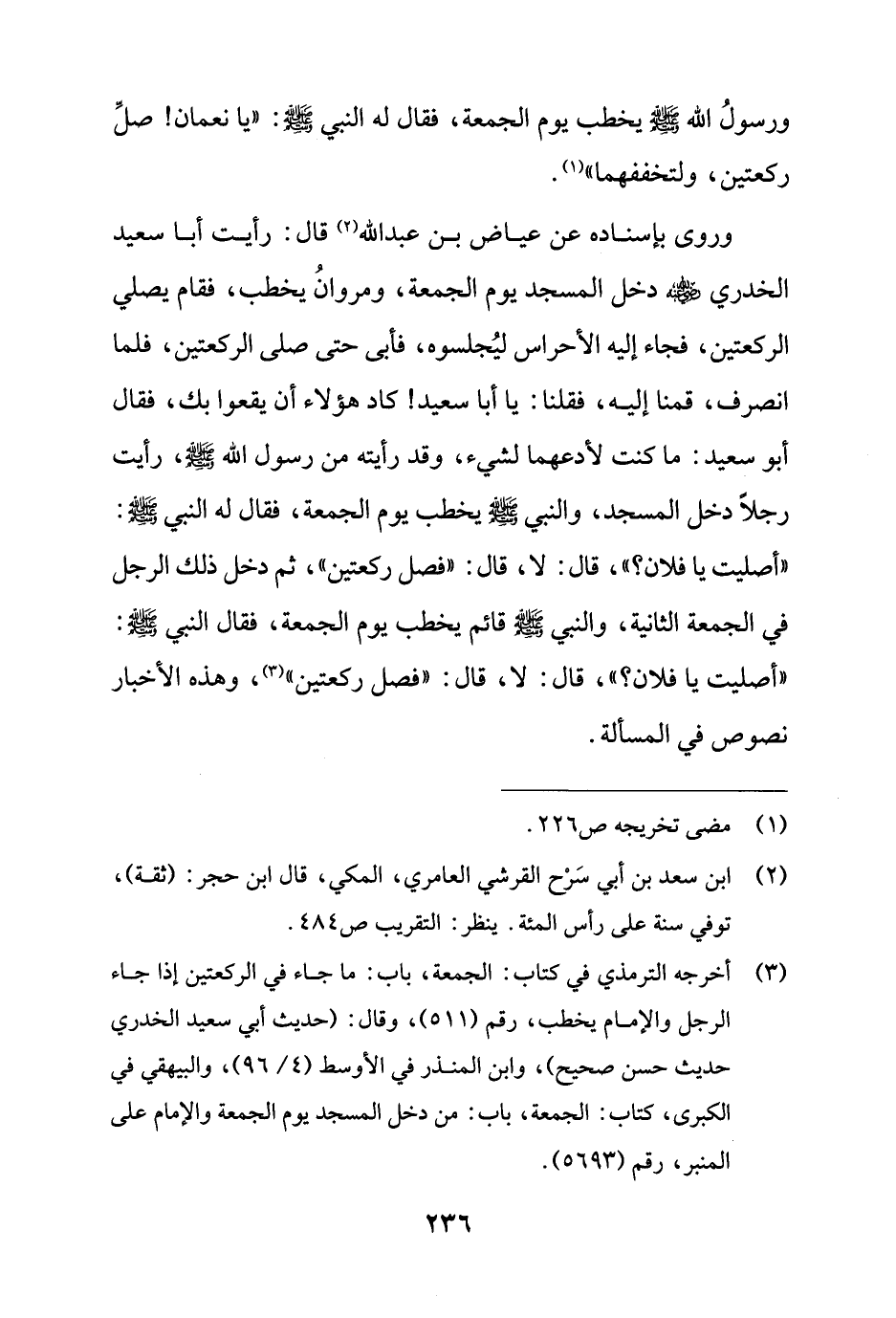 (¬3) أخرجه الترمذي في كتاب: الجمعة، باب: ما جاء في الركعتين إذا جاء الرجل والإمام يخطب، رقم (511)، وقال: (حديث أبي سعيد الخدري حديث حسن صحيح)، وابن المنذر في الأوسط (4/ 96)، والبيهقي في الكبرى، كتاب: الجمعة، باب: من دخل المسجد يوم الجمعة والإمام على المنبر، رقم (5693).