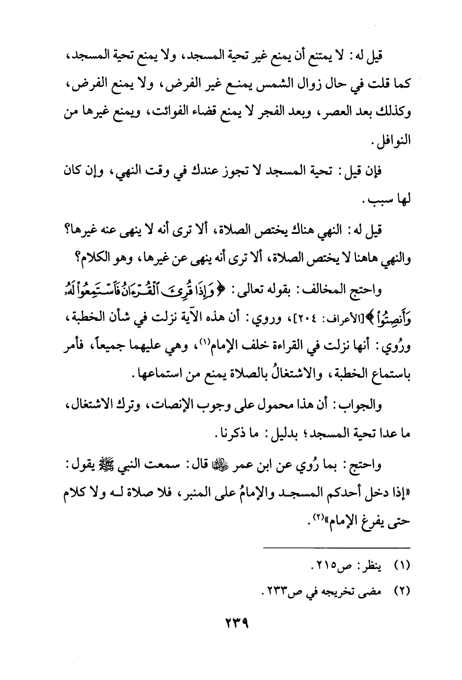 واحتج المخالف: بقوله تعالى: {وَإِذَا قُرِئَ الْقُرْآنُ فَاسْتَمِعُوا لَهُ وَأَنْصِتُوا} [الأعراف: 204]، وروي: أن هذه الآية نزلت في شأن الخطبة، ورُوي: أنها نزلت في القراءة خلف الإمام (¬1)، وهي عليهما جميعًا، فأمر باستماع الخطبة، والاشتغالُ بالصلاة يمنع من استماعها.
