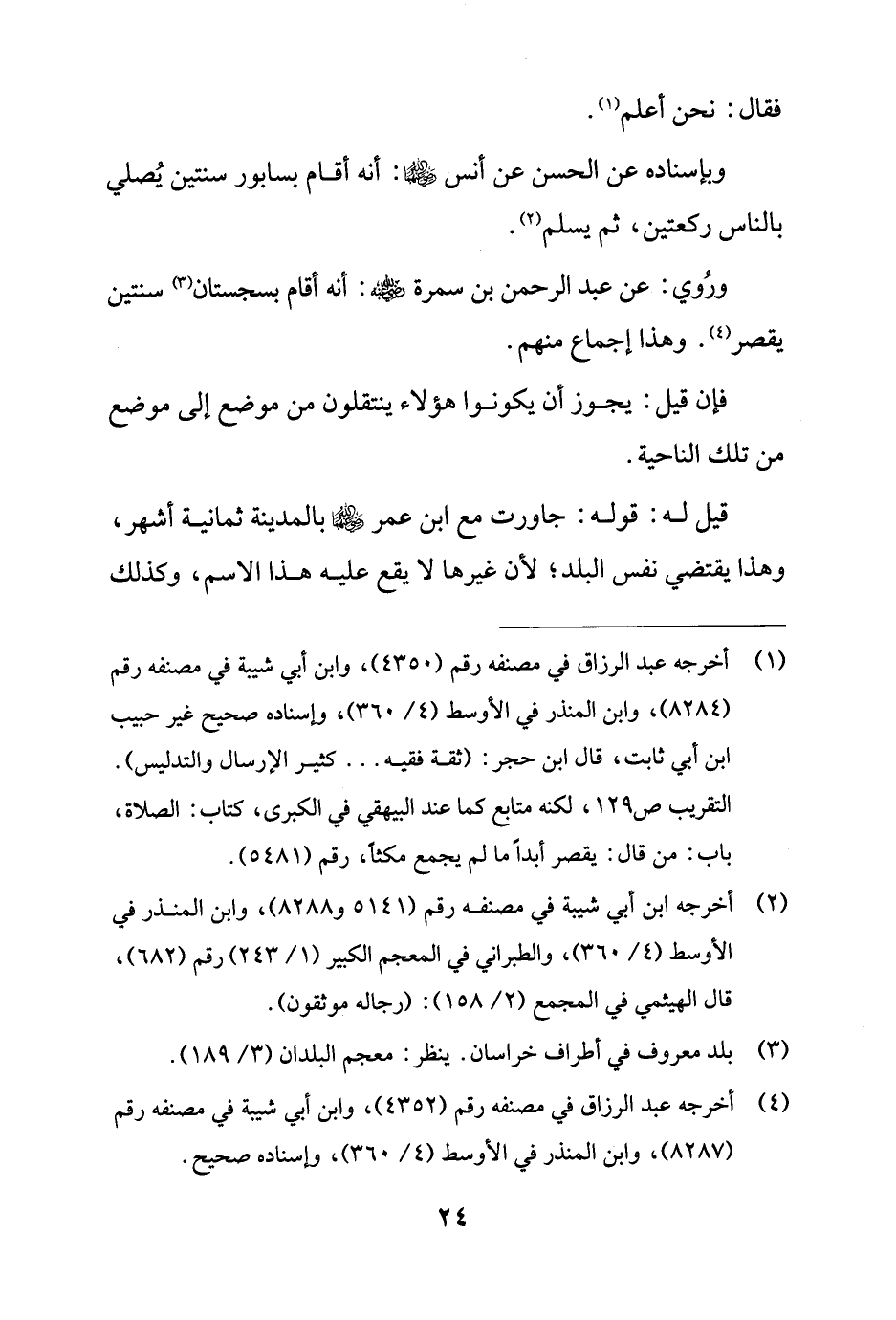 وبإسناده عن الحسن عن أنس - رضي الله عنهما -: أنه أقام بسابور سنتين يُصلي بالناس ركعتين، ثم يسلم (¬2).