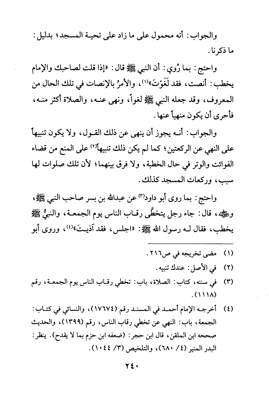 (¬4) أخرجه الإمام أحمد في المسند رقم (17674)، والنسائي في كتاب: الجمعة، باب: النهي عن تخطي رقاب الناس، رقم (1399)، والحديث صححه ابن الملقن، قال ابن حجر: (ضعفه ابن حزم بما لا يقدح). ينظر: البدر المنير (4/ 680)، والتلخيص (3/ 1044).