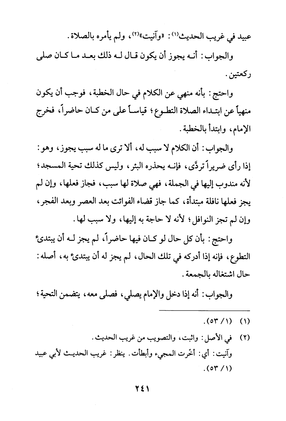 والجواب: أن الكلام لا سبب له، ألا ترى ما له سبب يجوز، وهو: إذا رأى ضريرًا تردَّى، فإنه يحذره البئر، وليس كذلك تحية المسجد؛ لأنه مندوب إليها في الجملة، فهي صلاة لها سبب، فجاز فعلها، وإن لم يجز فعلها نافلة مبتدأة، كما جاز قضاء الفوائت بعد العصر وبعد الفجر، وإن لم تجز النوافل؛ لأنه لا حاجة به إليها، ولا سبب لها.