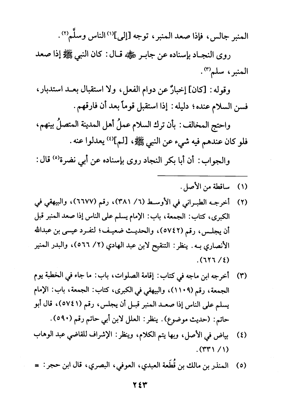 (¬3) أخرجه ابن ماجه في كتاب: إقامة الصلوات، باب: ما جاء في الخطبة يوم الجمعة، رقم (1109)، والبيهقي في الكبرى، كتاب: الجمعة، باب: الإمام يسلم على الناس إذا صعد المنبر قبل أن يجلس، رقم (5741)، قال أبو حاتم: (حديث موضوع). ينظر: العلل لابن أبي حاتم رقم (590).