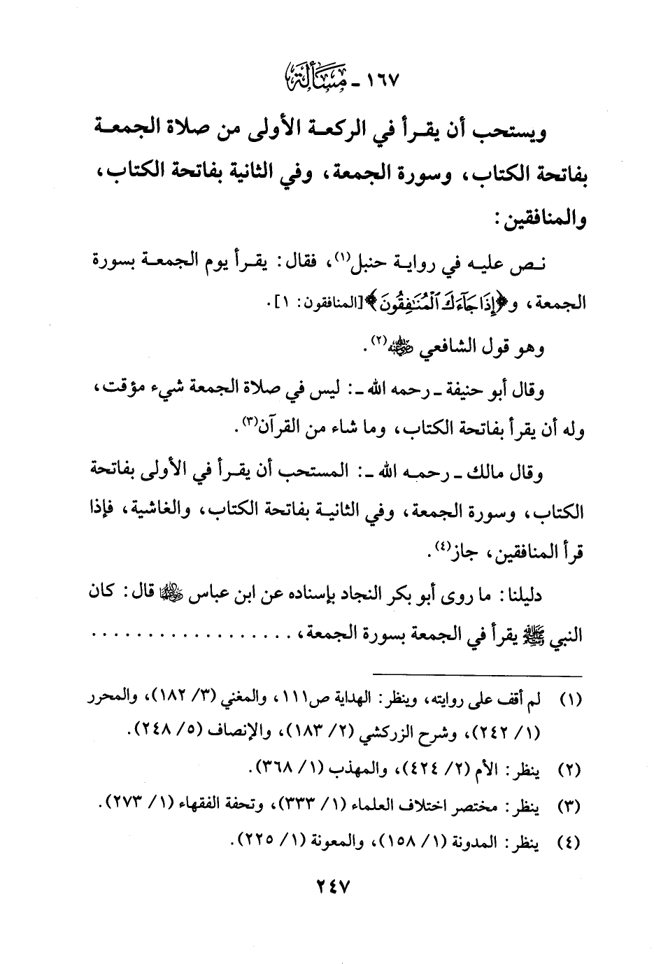 167 - مَسْألَة: ويستحب أن يقرأ في الركعة الأولى من صلاة الجمعة بفاتحة الكتاب، وسورة الجمعة، وفي الثانية بفاتحة الكتاب، والمنافقين: