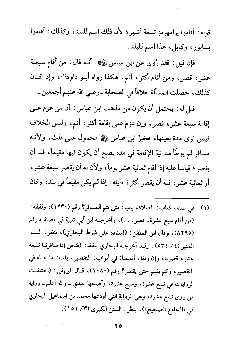 (¬1) في سننه، كتاب: الصلاة، باب: متى يتم المسافر؟ رقم (1230)، ولفظه: (من أقام سبع عشرة، قصر ... )، وأخرجه ابن أبي شيبة في مصنفه رقم (8295)، وقال ابن الملقن: (إسناده على شرط البخاري)، ينظر: البدر المنير (4/ 534). وقد أخرجه البخاري بلفظ: (فنحن إذا سافرنا تسعة عشر، قصرنا، وإن زدنا، أتممنا) في أبواب: التقصير، باب: ما جاء في التقصير، وكم يقيم حتى يقصر؟ رقم (1080)، قال البيهقي: (اختلفت الروايات في تسع عشرة، وسبع عشرة، وأصحها عندي - والله أعلم - رواية من روى تسع عشرة، وهي الرواية التي أودعها محمد بن إسماعيل البخاري في "الجامع الصحيح"). ينظر: السنن الكبرى (3/ 151).