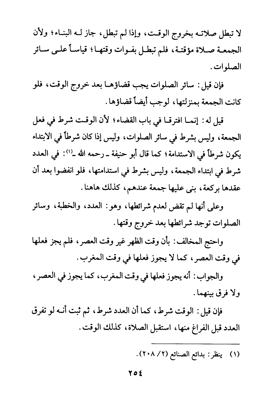 قيل له: إنما افترقا في باب القضاء؛ لأن الوقت شرط في فعل الجمعة، وليس بشرط في سائر الصلوات، وليس إذا كان شرطًا في الابتداء يكون شرطًا في الاستدامة؛ كما قال أبو حنيفة - رحمه الله - (¬1): في العدد شرط في ابتداء الجمعة، وليس بشرط في استدامتها، فلو انفضوا بعد أن عقدها بركعة، بنى عليها جمعة عندهم، كذلك ها هنا.