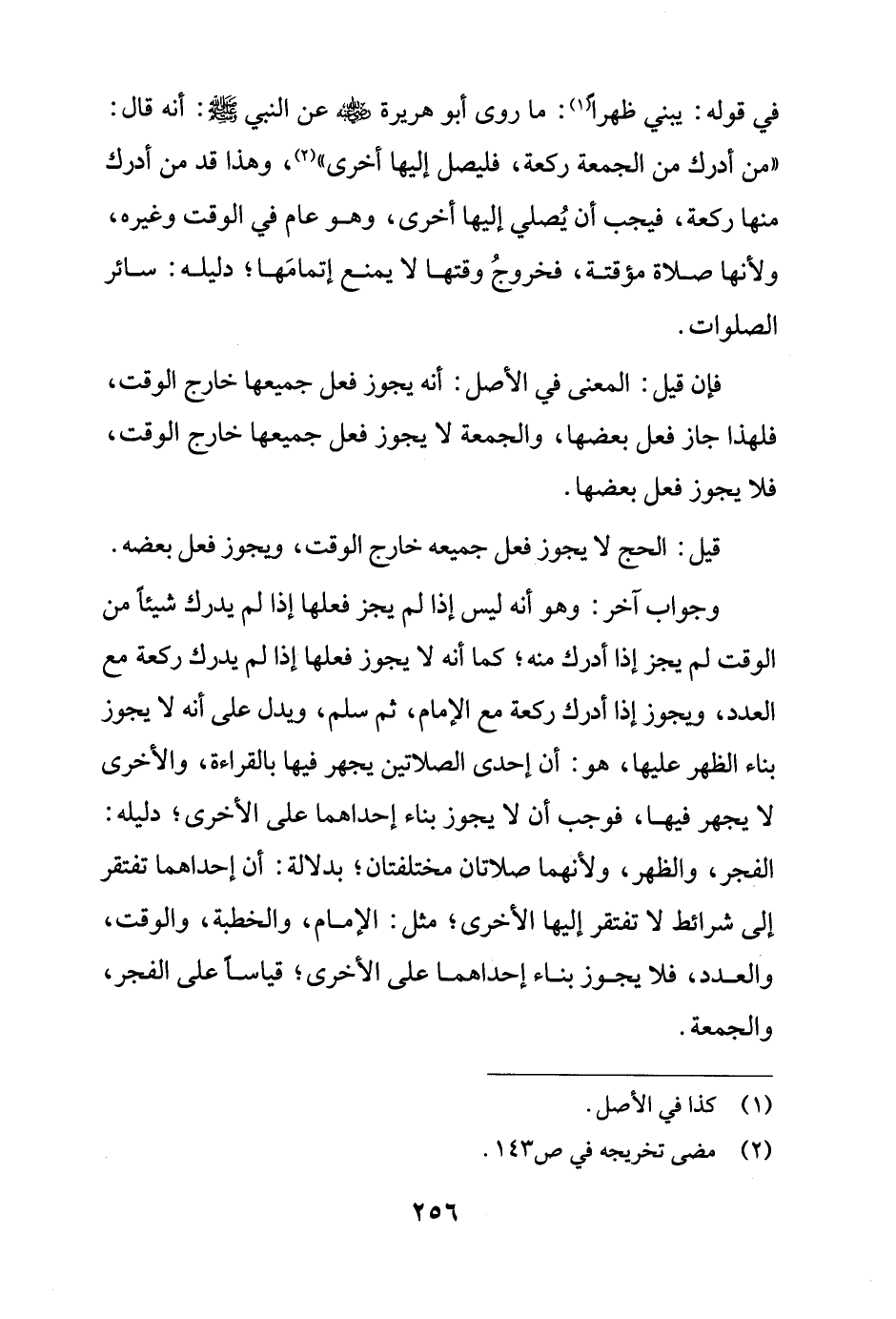 وجواب آخر: وهو أنه ليس إذا لم يجز فعلها إذا لم يدرك شيئًا من الوقت لم يجز إذا أدرك منه؛ كما أنه لا يجوز فعلها إذا لم يدرك ركعة مع العدد، ويجوز إذا أدرك ركعة مع الإمام، ثم سلم، ويدل على أنه لا يجوز بناء الظهر عليها، هو: أن إحدى الصلاتين يجهر فيها بالقراءة، والأخرى لا يجهر فيها، فوجب أن لا يجوز بناء إحداهما على الأخرى؛ دليله: الفجر، والظهر، ولأنهما صلاتان مختلفتان؛ بدلالة: أن إحداهما تفتقر إلى شرائط لا تفتقر إليها الأخرى؛ مثل: الإمام، والخطبة، والوقت، والعدد، فلا يجوز بناء إحداهما على الأخرى؛ قياسًا على الفجر، والجمعة.
