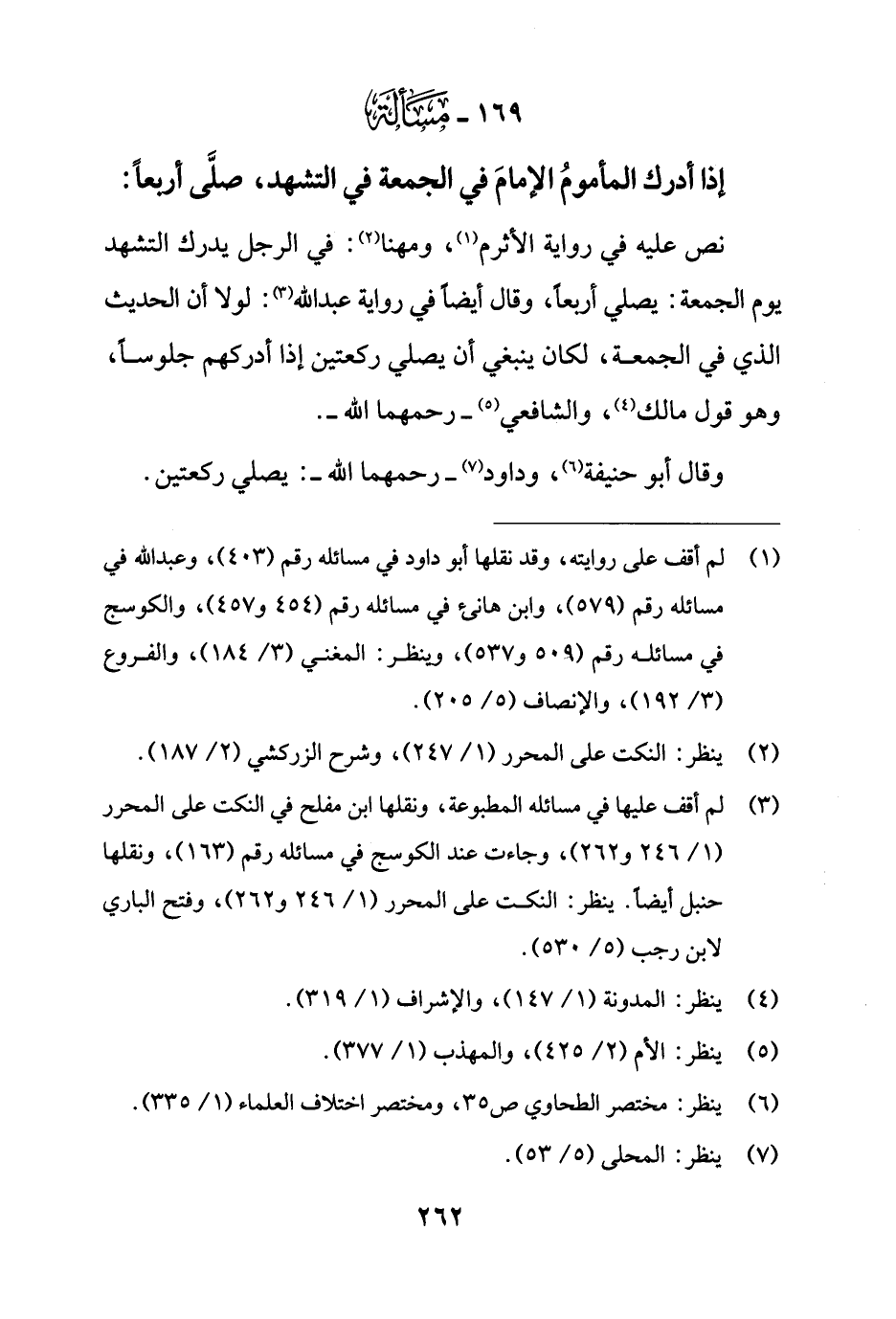 169 - مَسْألَة: إذا أدرك المأمومُ الإمامَ في الجمعة في التشهد، صلَّى أربعًا: