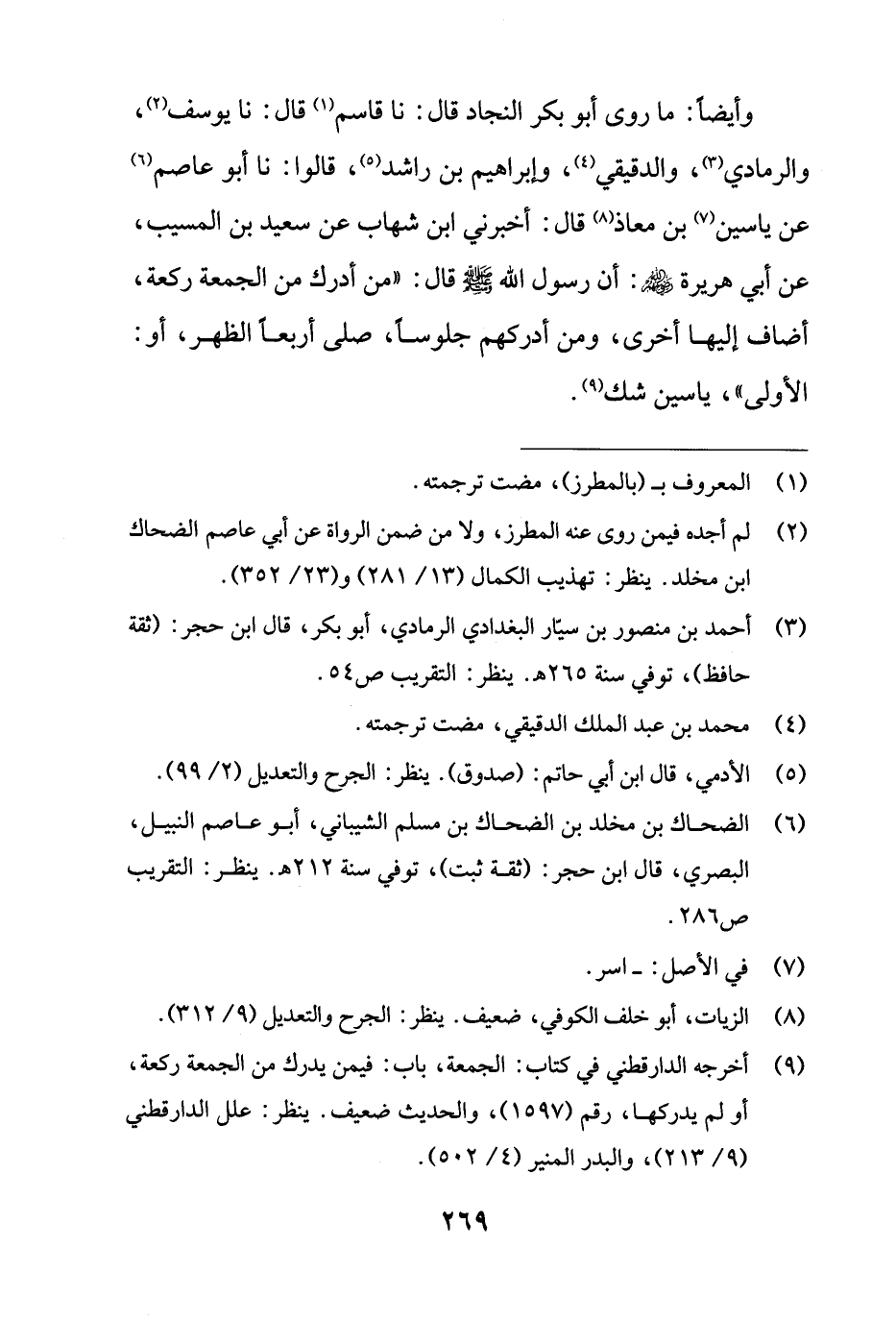 وأيضًا: ما روى أبو بكر النجاد قال: نا قاسم (¬1) قال: نا يوسف (¬2)، والرمادي (¬3)، والدقيقي (¬4)، وابراهيم بن راشد (¬5)، قالوا: نا أبو عاصم (¬6) عن ياسين (¬7) بن معاذ (¬8) قال: أخبرني ابن شهاب عن سعيد بن المسيب، عن أبي هريرة - رضي الله عنهم -: أن رسول الله - صلى الله عليه وسلم - قال: "من أدرك من الجمعة ركعة، أضاف إليها أخرى، ومن أدركهم جلوسًا، صلى أربعًا الظهر، أو: الأولى"، ياسين شك (¬9).