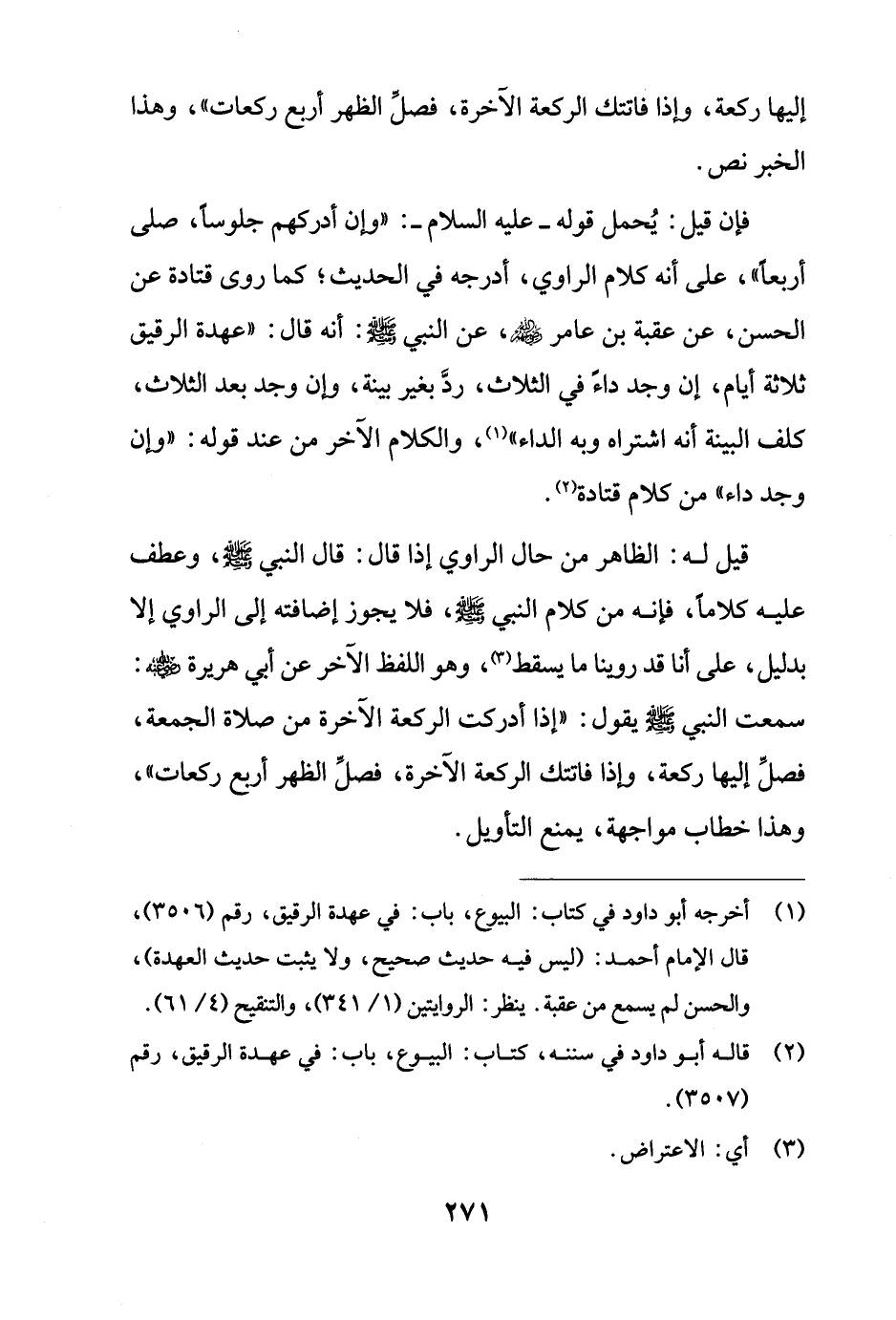 (¬1) أخرجه أبو داود في كتاب: البيوع، باب: في عهدة الرقيق، رقم (3506)، قال الإمام أحمد: (ليس فيه حديث صحيح، ولا يثبت حديث العهدة)، والحسن لم يسمع من عقبة. ينظر: الروايتين (1/ 341)، والتنقيح (4/ 61).