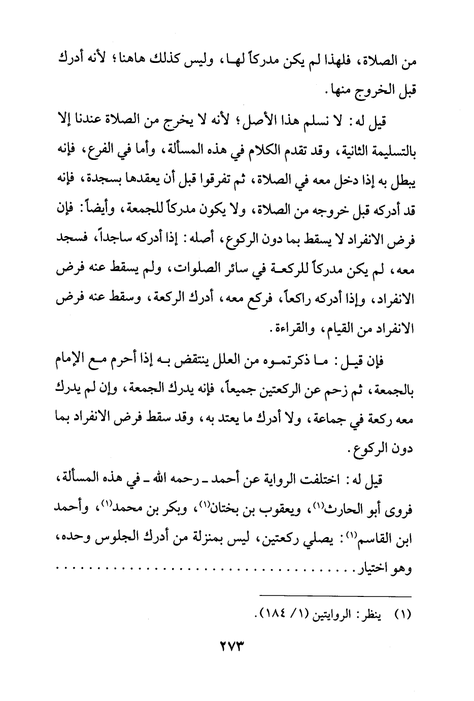 قيل له: اختلفت الرواية عن أحمد - رحمه الله - في هذه المسألة، فروى أبو الحارث (1)، ويعقوب بن بختان (1)، وبكر بن محمد (1)، وأحمد بن القاسم (¬1): يصلي ركعتين، ليس بمنزلة من أدرك الجلوس وحده، وهو اختيار ......................................................