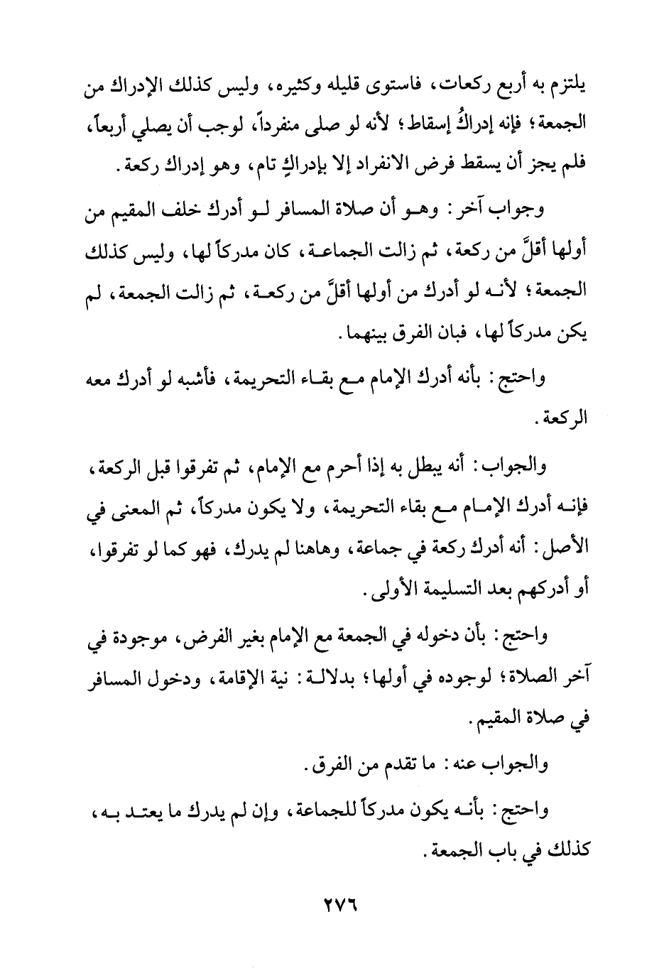 وجواب آخر: وهو أن صلاة المسافر لو أدرك خلف المقيم من أولها أقلَّ من ركعة، ثم زالت الجماعة، كان مدركًا لها، وليس كذلك الجمعة؛ لأنه لو أدرك من أولها أقلَّ من ركعة، ثم زالت الجمعة، لم يكن مدركًا لها، فبان الفرق بينهما.