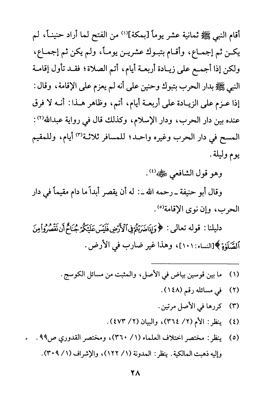 أقام النبي - صلى الله عليه وسلم - ثمانية عشر يومًا [بمكة] (¬1) من الفتح لما أراد حنينًا، لم يكن ثم إجماع، وأقام بتبوك عشرين يومًا، ولم يكن ثم إجماع، ولكن إذا أجمع على زيادة أربعة أيام، أتم الصلاة؛ فقد تأول إقامة النبي - صلى الله عليه وسلم - بدار الحرب بتبوك وحنين على أنه لم يعزم على الإقامة، وقال: إذا عزم على الزيادة على أربعة أيام، أتم، وظاهر هذا: أنه لا فرق عنده بين دار الحرب، ودار الإسلام، وكذلك قال في رواية عبد الله (¬2): المسح في دار الحرب وغيره واحد؛ للمسافر ثلاثة (¬3) أيام، وللمقيم يوم وليلة.