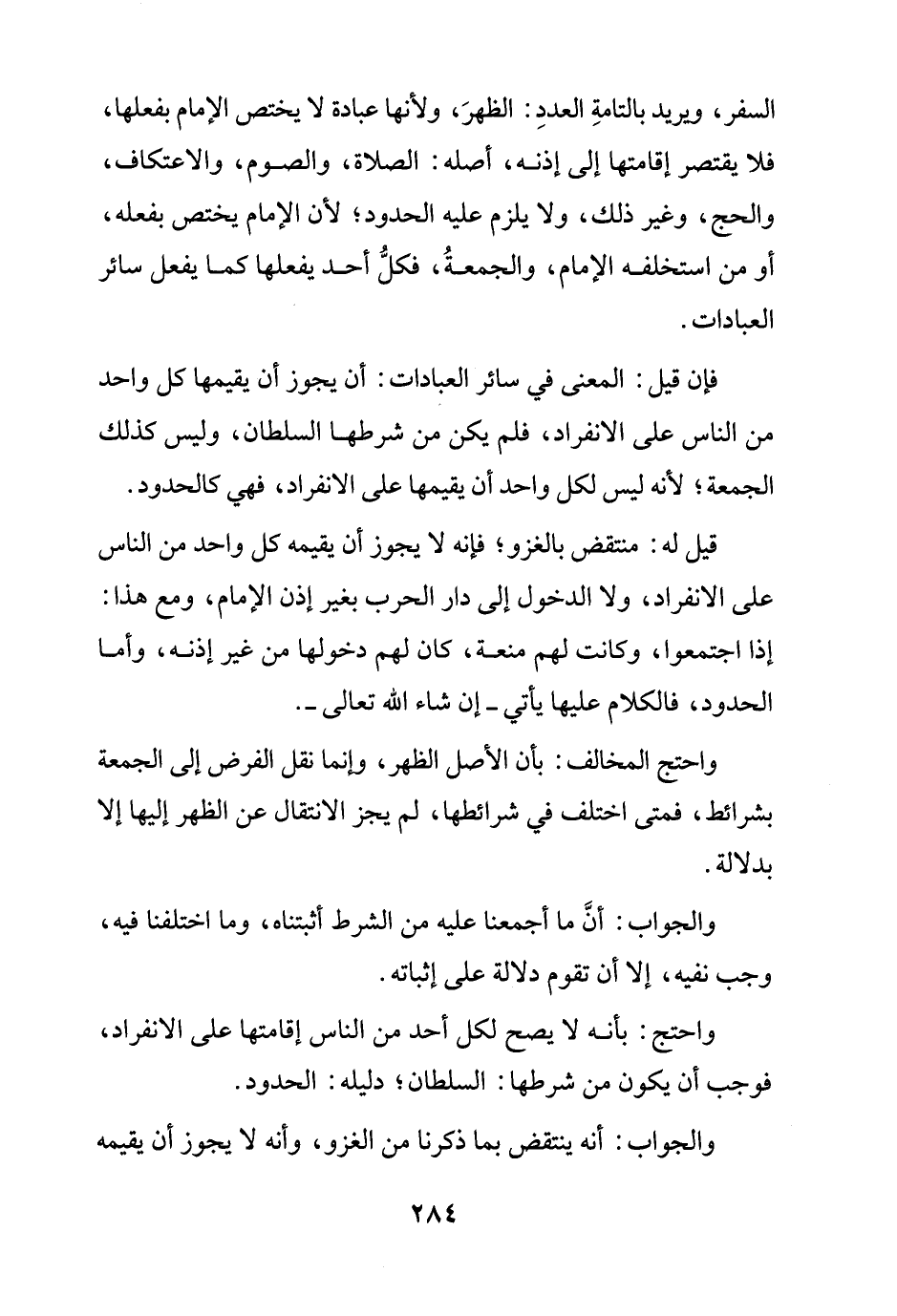 السفر، ويريد بالتامةِ العددِ: الظهرَ، ولأنها عبادة لا يختص الإمام بفعلها، فلا يقتصر إقامتها إلى إذنه، أصله: الصلاة، والصوم، والاعتكاف، والحج، وغير ذلك، ولا يلزم عليه الحدود؛ لأن الإمام يختص بفعله، أو من استخلفه الإمام، والجمعةُ، فكلُّ أحد يفعلها كما يفعل سائر العبادات.