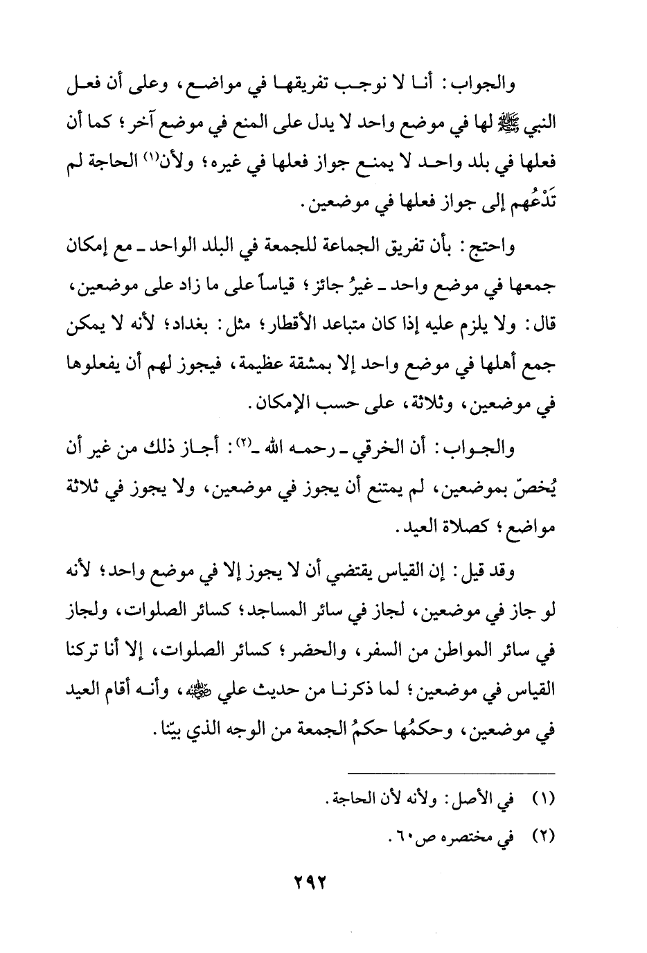 والجواب: أنا لا نوجب تفريقها في مواضع، وعلى أن فعل النبي - صلى الله عليه وسلم - لها في موضع واحد لا يدل على المنع في موضع آخر؛ كما أن فعلها في بلد واحد لا يمنع جواز فعلها في غيره؛ ولأن (¬1) الحاجة لم تَدْعُهم إلى جواز فعلها في موضعين.