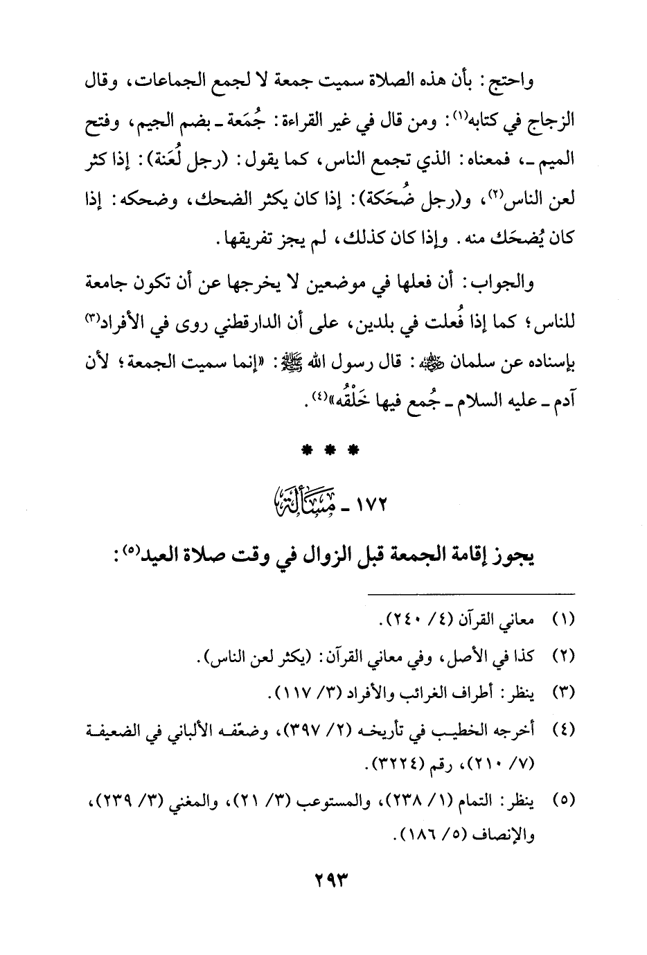 172 - مَسْألَة: يجوز إقامة الجمعة قبل الزوال في وقت صلاة العيد (¬5):