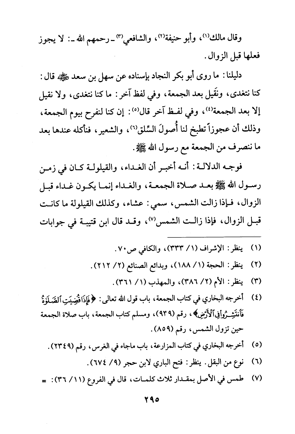 دليلنا: ما روى أبو بكر النجاد بإسناده عن سهل بن سعد - رضي الله عنه - قال: كنا نتغدى، ونَقيل بعد الجمعة، وفي لفظ آخر: ما كنا نتغدى، ولا نقيل إلا بعد الجمعة (¬4)، وفي لفظ آخر قال (¬5): إن كنا لنفرح بيوم الجمعة، وذلك أن عجوزًا تطبخ لنا أُصولَ السِّلق (¬6)، والشعير، فنأكله عندها بعد ما ننصرف من الجمعة مع رسول الله - صلى الله عليه وسلم -.