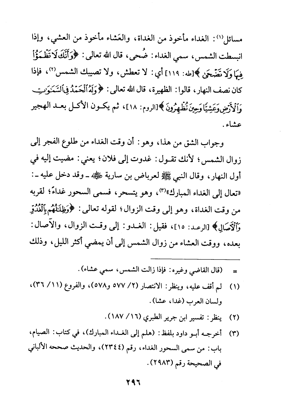 مسائل (¬1): الغداء مأخوذ من الغداة، والعَشاء مأخوذ من العشي، وإذا انبسطت الشمس، سمي الغداء: ضُحى، قال الله تعالى: {وَأَنَّكَ لَا تَظْمَأُ فِيهَا وَلَا تَضْحَى} [طه: 119]، أي: لا تعطش، ولا تصيبك الشمس (¬2)، فإذا كان نصف النهار، قالوا: الظهيرة، قال الله تعالى: {وَلَهُ الْحَمْدُ فِي السَّمَاوَاتِ وَالْأَرْضِ وَعَشِيًّا وَحِينَ تُظْهِرُونَ} [الروم: 18]، ثم يكون الأكل بعد الهجير عشاء.