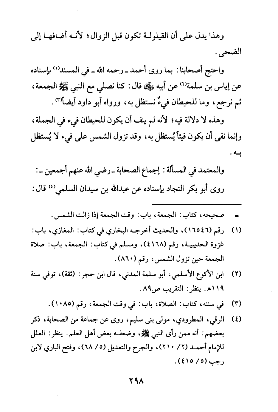 واحتج أصحابنا: بما روى أحمد - رحمه الله - في المسند (¬1) بإسناده عن إياس بن سلمة (¬2) عن أبيه - رضي الله عنهما - قال: كنا نصلي مع النبي - صلى الله عليه وسلم - الجمعة، ثم نرجع، وما للحيطان فيءٌ نستظل به، ورواه أبو داود أيضًا (¬3).
