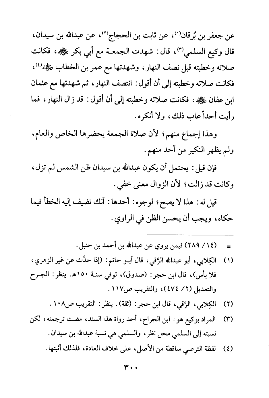 عن جعفر بن بُرقان (¬1)، عن ثابت بن الحجاج (¬2)، عن عبد الله بن سيدان، قال وكيع السلمي (¬3)، قال: شهدت الجمعة مع أبي بكر - رضي الله عنه -، فكانت صلاته وخطبته قبل نصف النهار، وشهدتها مع عمر بن الخطاب - رضي الله عنه - (¬4)، فكانت صلاته وخطبته إلى أن أقول: انتصف النهار، ثم شهدتها مع عثمان بن عفان - رضي الله عنه -، فكانت صلاته وخطبته إلى أن أقول: قد زال النهار، فما رأيت أحدًا عاب ذلك، ولا أنكره.