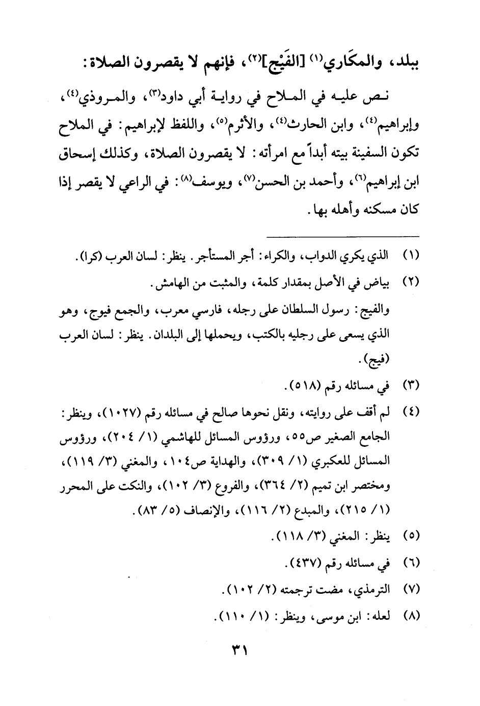 نص عليه في الملاح في رواية أبي داود (¬3)، والمروذي (4)، وإبراهيم (¬4)، وابن الحارث (4)، والأثرم (¬5)، واللفظ لإبراهيم: في الملاح تكون السفينة بيته أبدًا مع امرأته: لا يقصرون الصلاة، وكذلك إسحاق بن إبراهيم (¬6)، وأحمد بن الحسن (¬7)، ويوسف (¬8): في الراعي لا يقصر إذا كان مسكنه وأهله بها.