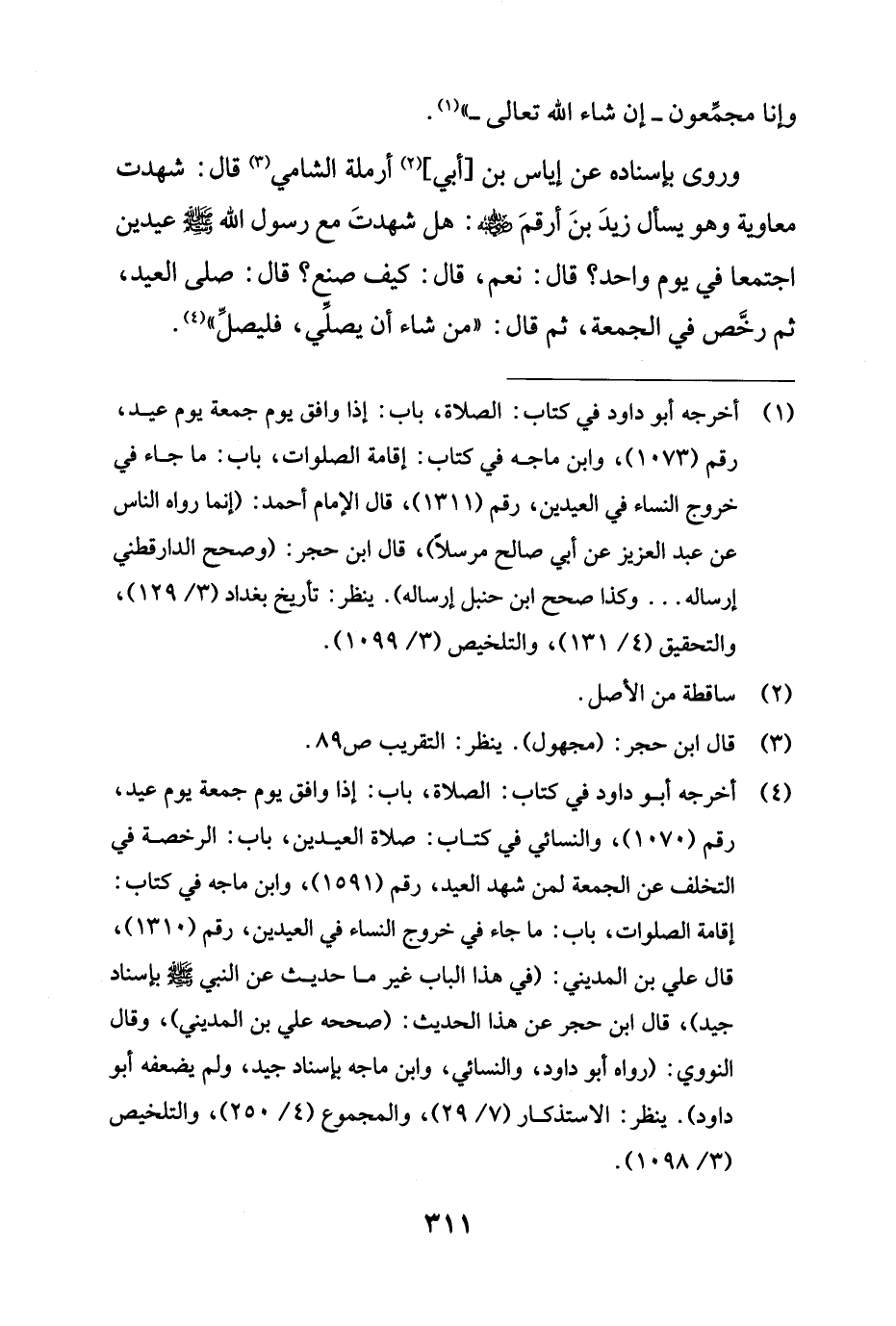 (¬4) أخرجه أبو داود في كتاب: الصلاة، باب: إذا وافق يوم جمعة يوم عيد، رقم (1070)، والنسائي في كتاب: صلاة العيدين، باب: الرخصة في التخلف عن الجمعة لمن شهد العيد، رقم (1591)، وابن ماجه في كتاب: إقامة الصلوات، باب: ما جاء في خروج النساء في العيدين، رقم (1310)، قال علي بن المديني: (في هذا الباب غير ما حديث عن النبي - صلى الله عليه وسلم - بإسناد جيد)، قال ابن حجر عن هذا الحديث: (صححه علي بن المديني)، وقال النووي: (رواه أبو داود، والنسائي، وابن ماجه بإسناد جيد، ولم يضعفه أبو داود). ينظر: الاستذكار (7/ 29)، والمجموع (4/ 250)، والتلخيص (3/ 1098).