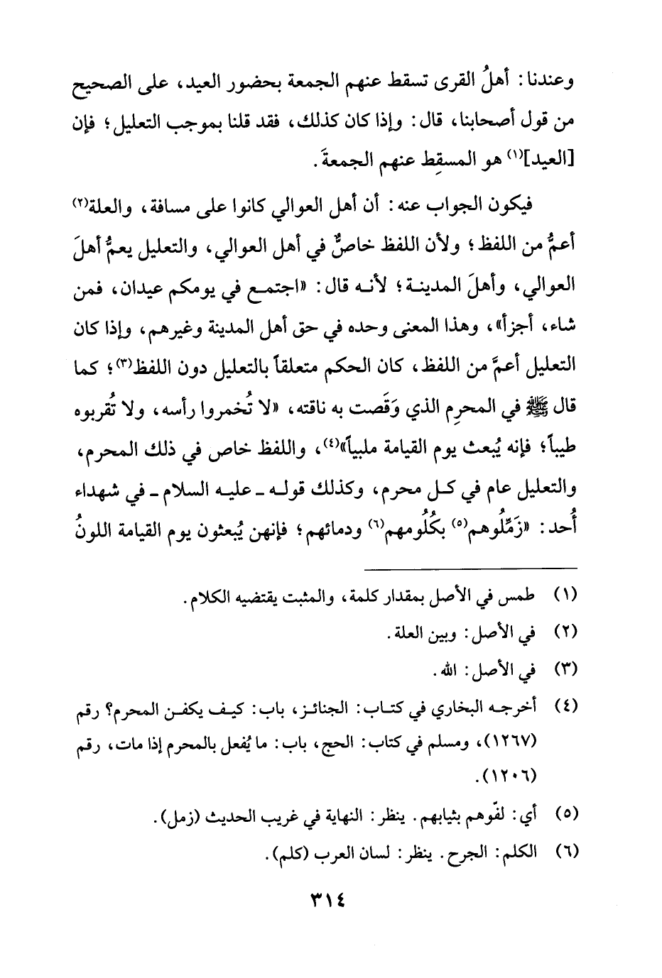فيكون الجواب عنه: أن أهل العوالي كانوا على مسافة، والعلة (¬2) أعمُّ من اللفظ؛ ولأن اللفظ خاصٌّ في أهل العوالي، والتعليل يعمُّ أهلَ العوالي، وأهلَ المدينة؛ لأنه قال: "اجتمع في يومكم عيدان، فمن شاء، أجزأ"، وهذا المعنى وحده في حق أهل المدينة وغيرهم، وإذا كان التعليل أعمَّ من اللفظ، كان الحكم متعلقًا بالتعليل دون اللفظ (¬3)؛ كما قال - صلى الله عليه وسلم - في المحرِم الذي وَقَصت به ناقته، "لا تُخمروا رأسه، ولا تُقربوه طيبًا؛ فإنه يُبعث يوم القيامة ملبيًا" (¬4)، واللفظ خاص في ذلك المحرم، والتعليل عام في كل محرم، وكذلك قوله - عليه السلام - في شهداء أُحد: "زَمِّلُوهم (¬5) بكُلُومهم (¬6) ودمائهم؛ فإنهن يُبعثون يوم القيامة اللونُ