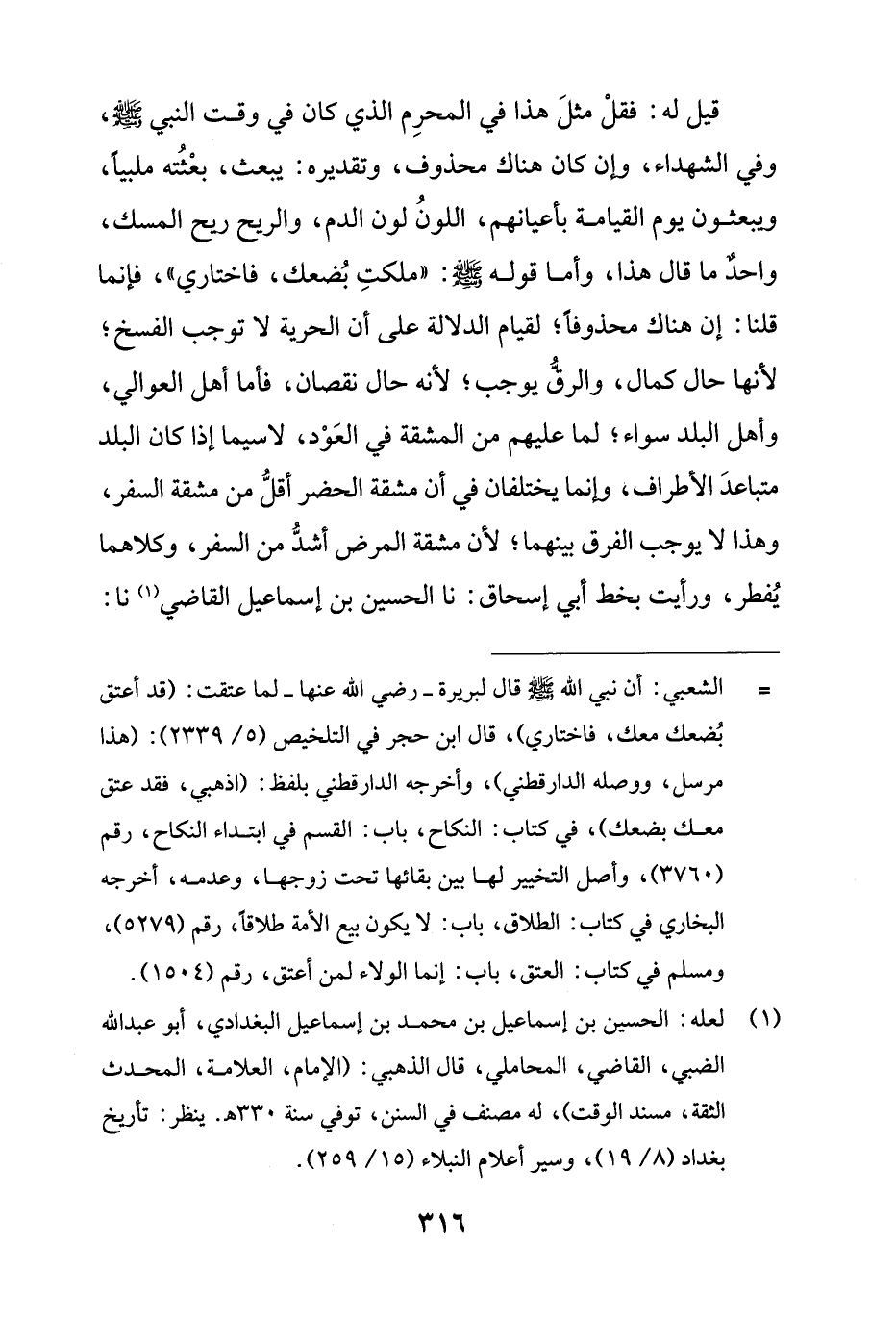 قيل له: فقلْ مثلَ هذا في المحرِم الذي كان في وقت النبي - صلى الله عليه وسلم -، وفي الشهداء، وإن كان هناك محذوف، وتقديره: يبعث، بعْثتُه ملبيًا، ويبعثون يوم القيامة بأعيانهم، اللونُ لون الدم، والريح ريح المسك، واحدٌ ما قال هذا، وأما قوله - صلى الله عليه وسلم -: "ملكتِ بُضعك، فاختاري"، فإنما قلنا: إن هناك محذوفًا؛ لقيام الدلالة على أن الحرية لا توجب الفسخ؛ لأنها حال كمال، والرقُّ يوجب؛ لأنه حال نقصان، فأما أهل العوالي، وأهل البلد سواء؛ لما عليهم من المشقة في العَوْد، لا سيما إذا كان البلد متباعدَ الأطراف، وإنما يختلفان في أن مشقة الحضر أقلُّ من مشقة السفر، وهذا لا يوجب الفرق بينهما؛ لأن مشقة المرض أشدُّ من السفر، وكلاهما يُفطر، ورأيت بخط أبي إسحاق: نا الحسين بن إسماعيل القاضي (¬1) نا: