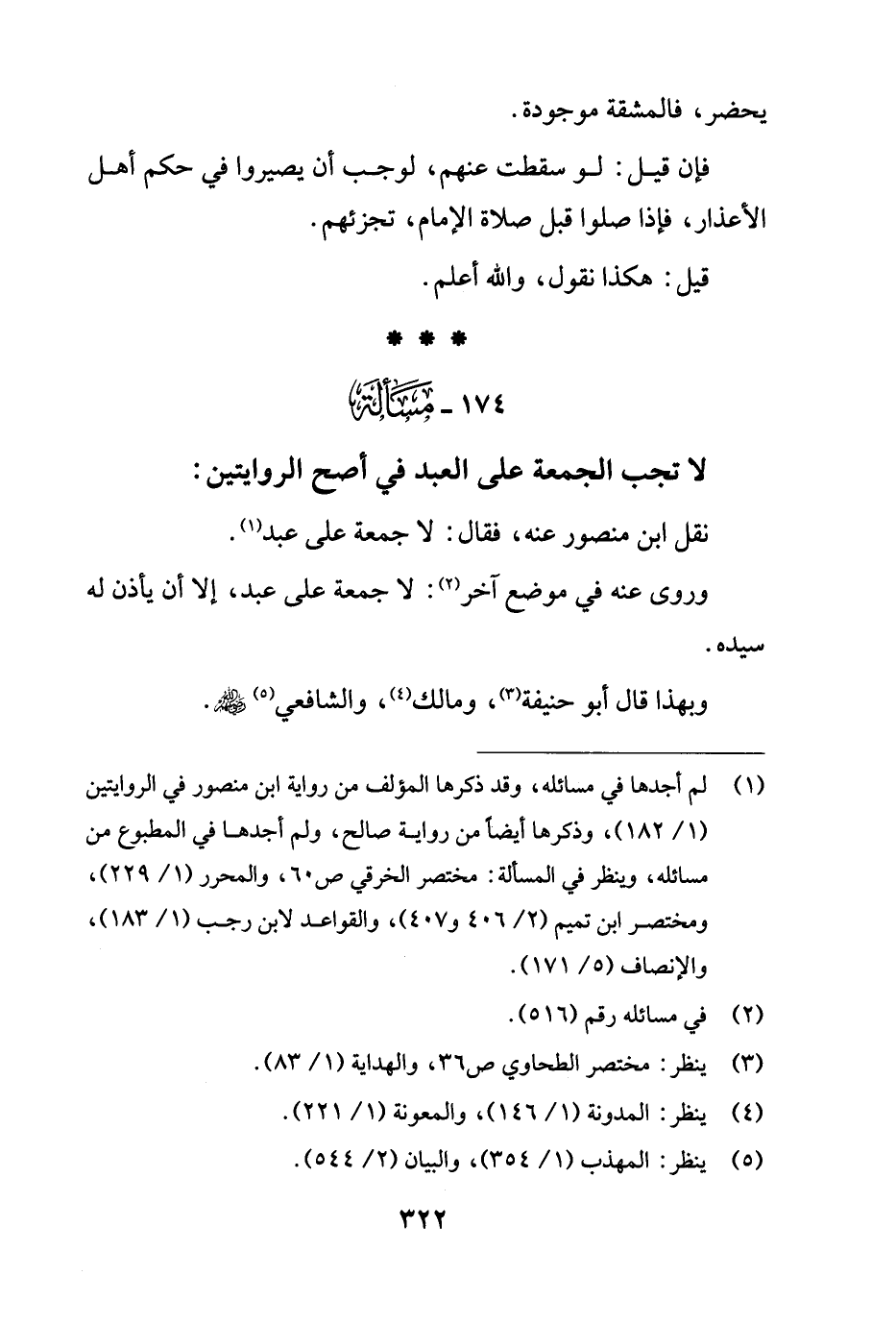 174 - مَسْألَة: لا تجب الجمعة على العبد في أصح الروايتين: