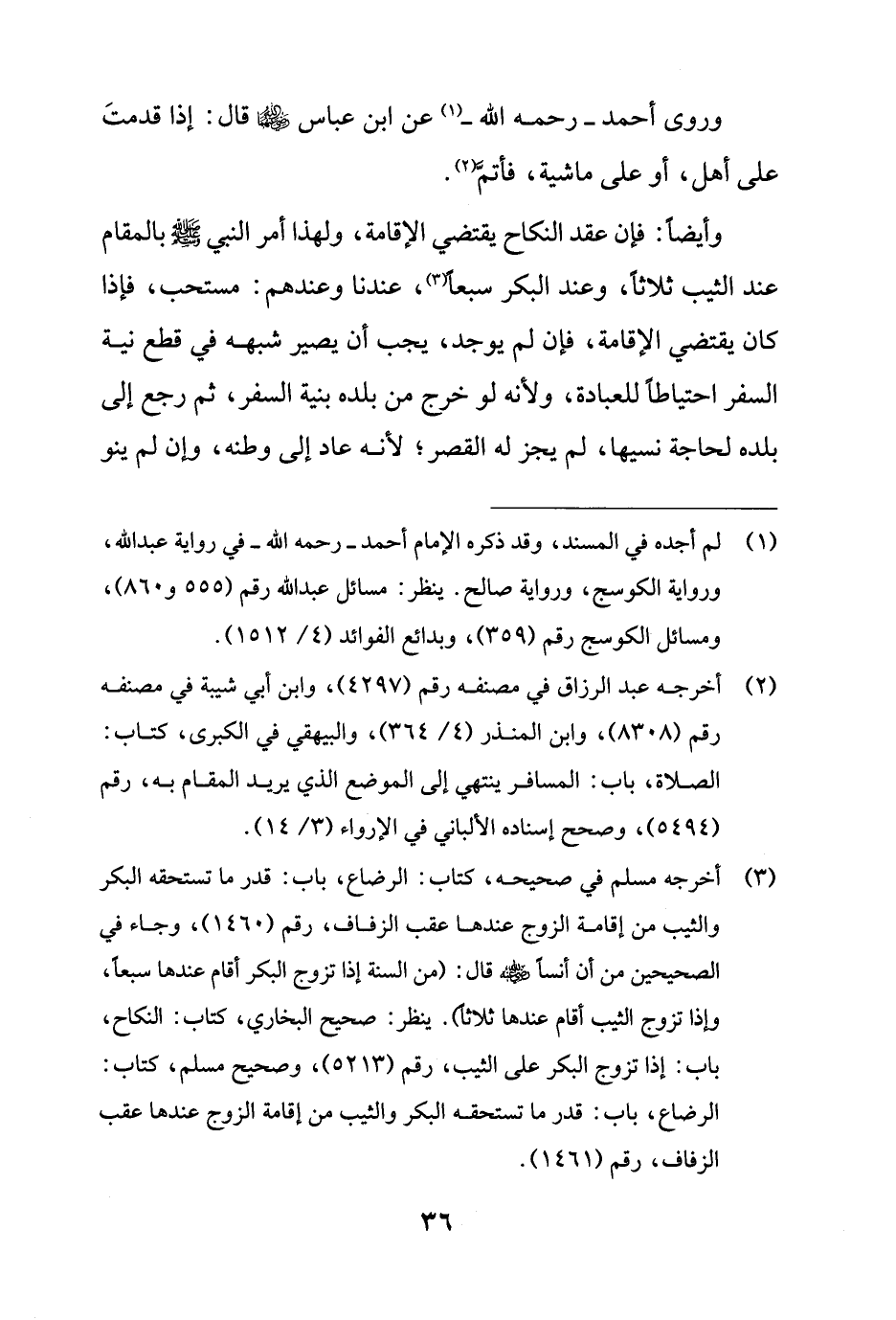 (¬3) أخرجه مسلم في صحيحه، كتاب: الرضاع، باب: قدر ما تستحقه البكر والثيب من إقامة الزوج عندها عقب الزفاف، رقم (1460)، وجاء في الصحيحين من أن أنسًا - رضي الله عنه - قال: (من السنة إذا تزوج البكر أقام عندها سبعًا، وإذا تزوج الثيب أقام عندها ثلاثًا). ينظر: صحيح البخاري، كتاب: النكاح، باب: إذا تزوج البكر على الثيب، رقم (5213)، وصحيح مسلم، كتاب: الرضاع، باب: قدر ما تستحقه البكر والثيب من إقامة الزوج عندها عقب الزفاف، رقم (1461).