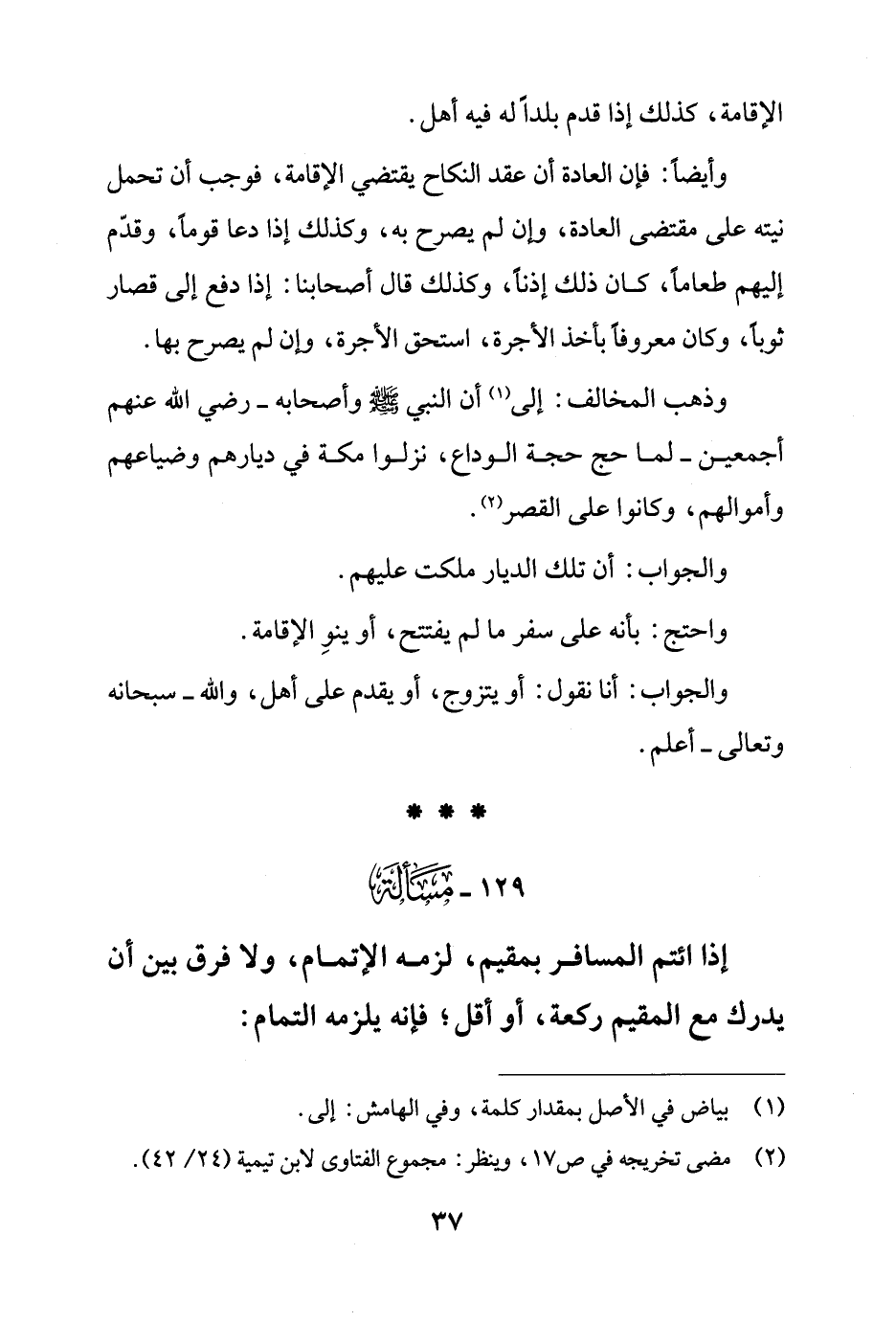 129 - مَسْألَة: إذا ائتم المسافر بمقيم، لزمه الإتمام، ولا فرق بين أن يدرك مع المقيم ركعة، أو أقل؛ فإنه يلزمه التمام: