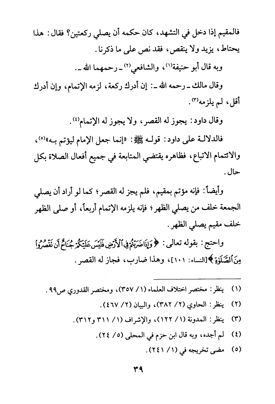 وأيضًا: فإنه مؤتم بمقيم، فلم يجز له القصر؛ كما لو أراد أن يصلي الجمعة خلف من يصلي الظهر؛ فإنه يلزمه الإتمام أربعًا، أو صلى الظهر خلف مقيم يصلي الظهر.