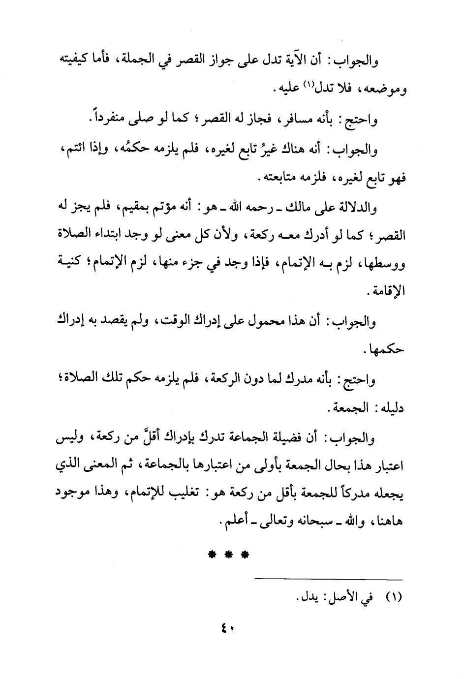 والجواب: أن فضيلة الجماعة تدرك بإدراك أقلَّ من ركعة، وليس اعتبار هذا بحال الجمعة بأولى من اعتبارها بالجماعة، ثم المعنى الذي يجعله مدركًا للجمعة بأقل من ركعة هو: تغليب للإتمام، وهذا موجود ها هنا، والله - سبحانه وتعالى - أعلم.
