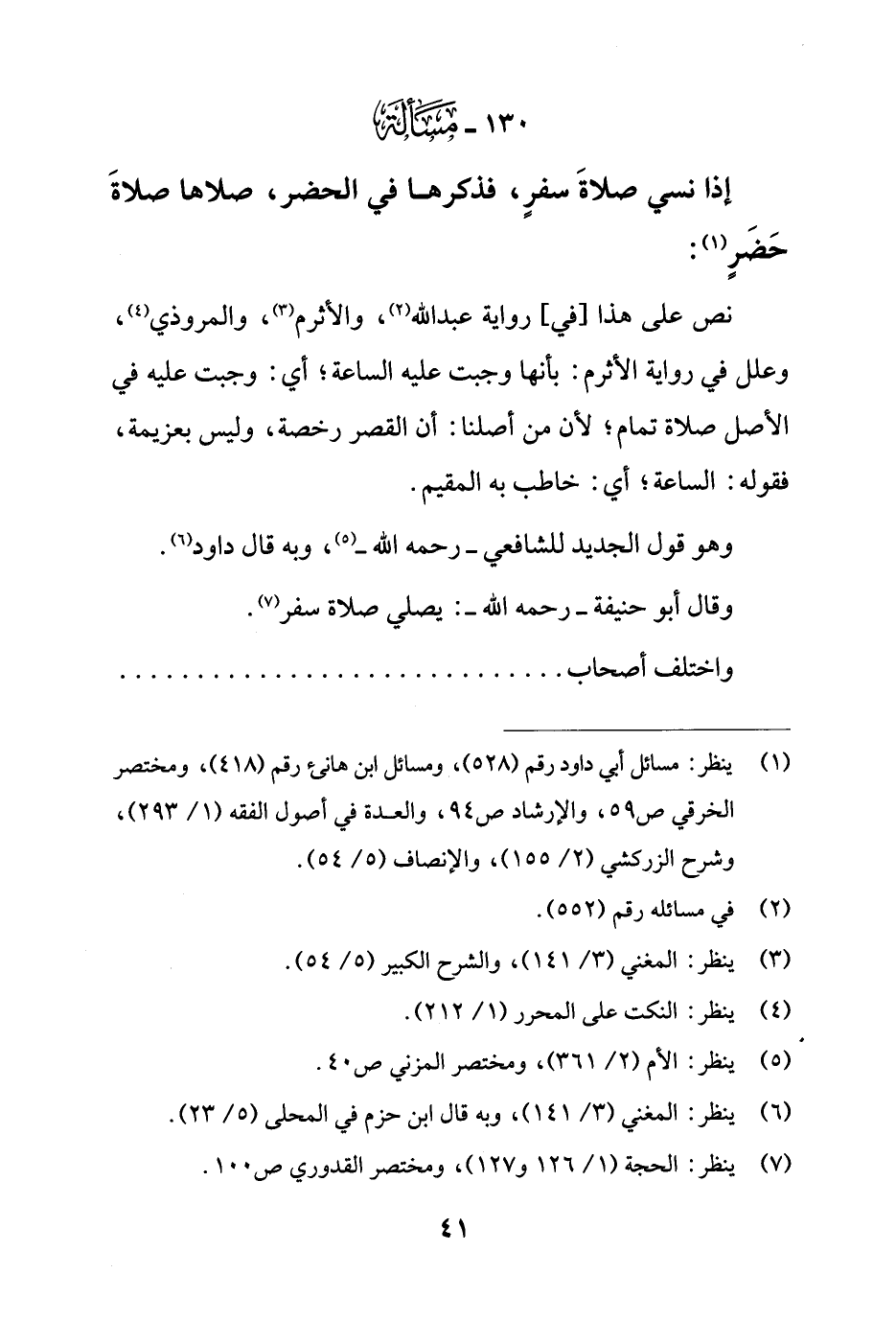 130 - مَسْألَة: إذا نسي صلاةَ سفرٍ، فذكرها في الحضر، صلاها صلاةَ حَضَرٍ (¬1):