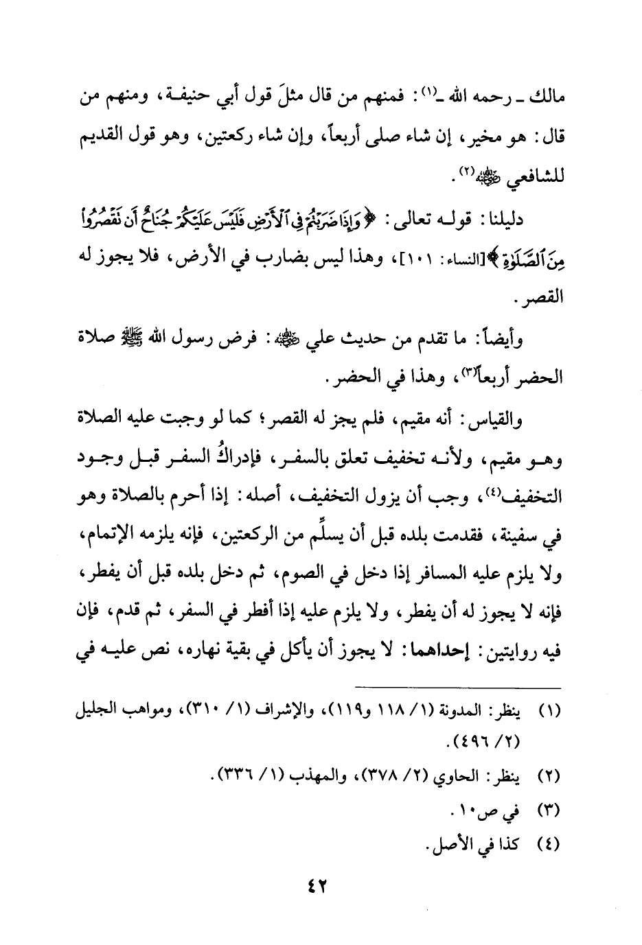 مالك - رحمه الله - (¬1): فمنهم من قال مثلَ قول أبي حنيفة، ومنهم من قال: هو مخير، إن شاء صلى أربعًا، وإن شاء ركعتين، وهو قول القديم للشافعي - رضي الله عنه - (¬2).