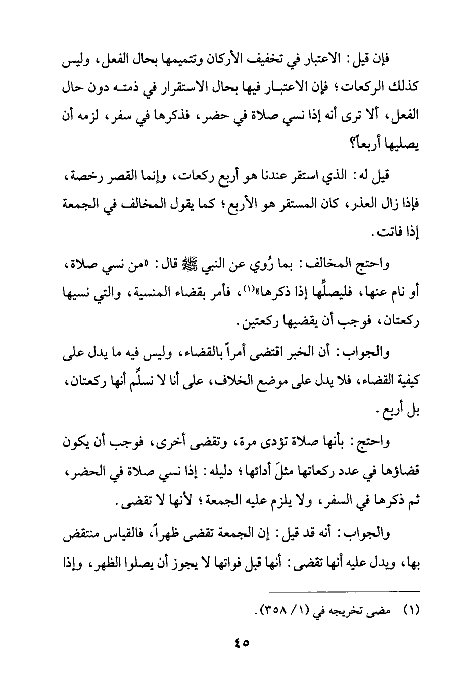 والجواب: أن الخبر اقتضى أمرًا بالقضاء، وليس فيه ما يدل على كيفية القضاء، فلا يدل على موضع الخلاف، على أنا لا نسلِّم أنها ركعتان، بل أربع.
