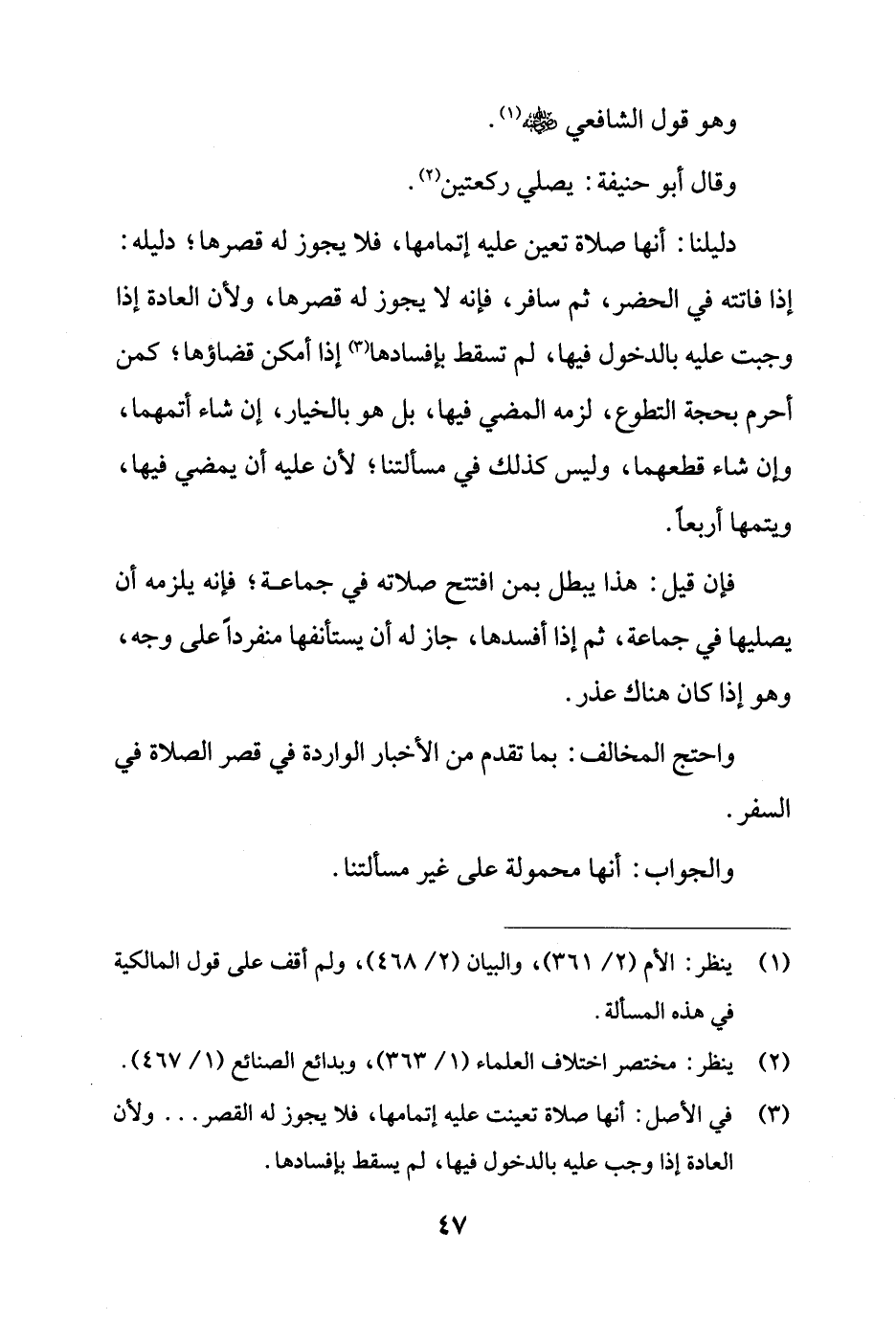 (¬3) في الأصل: أنها صلاة تعينت عليه إتمامها، فلا يجوز له القصر ... ولأن العادة إذا وجب عليه بالدخول فيها، لم يسقط بإفسادها.