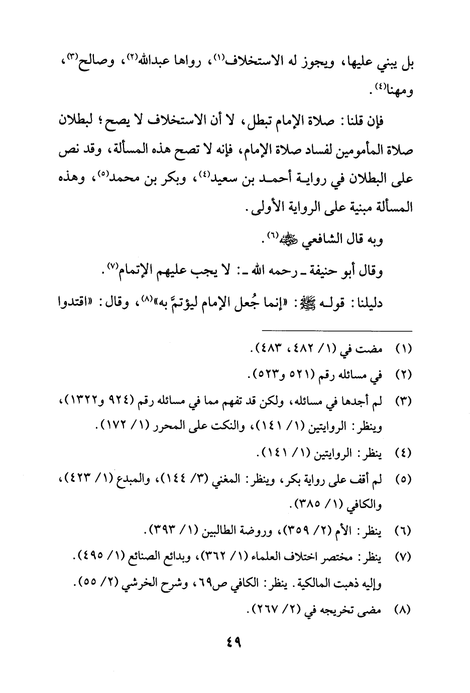 فإن قلنا: صلاة الإمام تبطل، لا أن الاستخلاف لا يصح؛ لبطلان صلاة المأمومين لفساد صلاة الإمام، فإنه لا تصح هذه المسألة، وقد نص على البطلان في رواية أحمد بن سعيد (4)، وبكر بن محمد (¬5)، وهذه المسألة مبنية على الرواية الأولى.