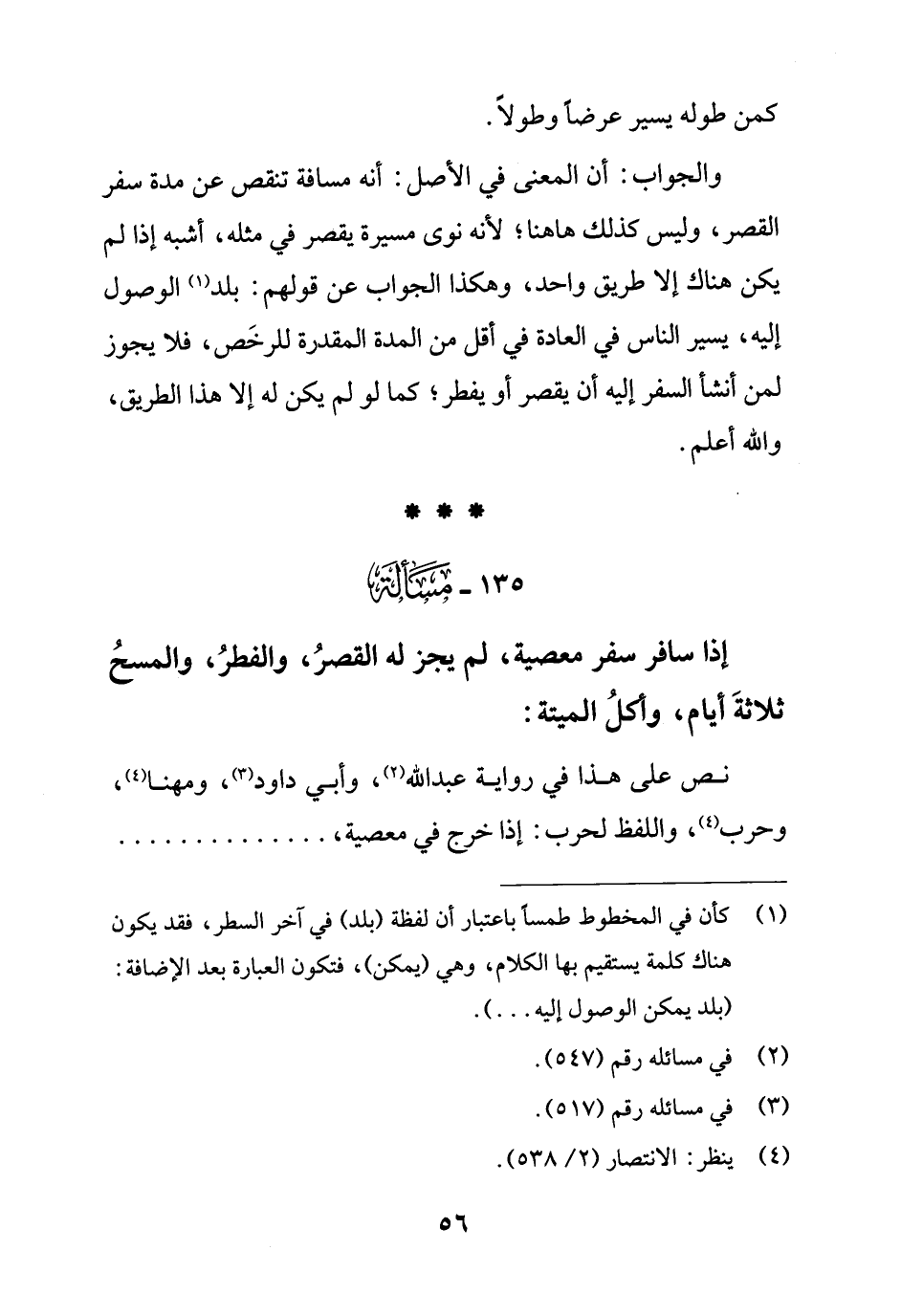135 - مَسْألَة: إذا سافر سفر معصية، لم يجز له القصرُ، والفطرُ، والمسحُ ثلاثةَ أيام، وأكلُ الميتة: