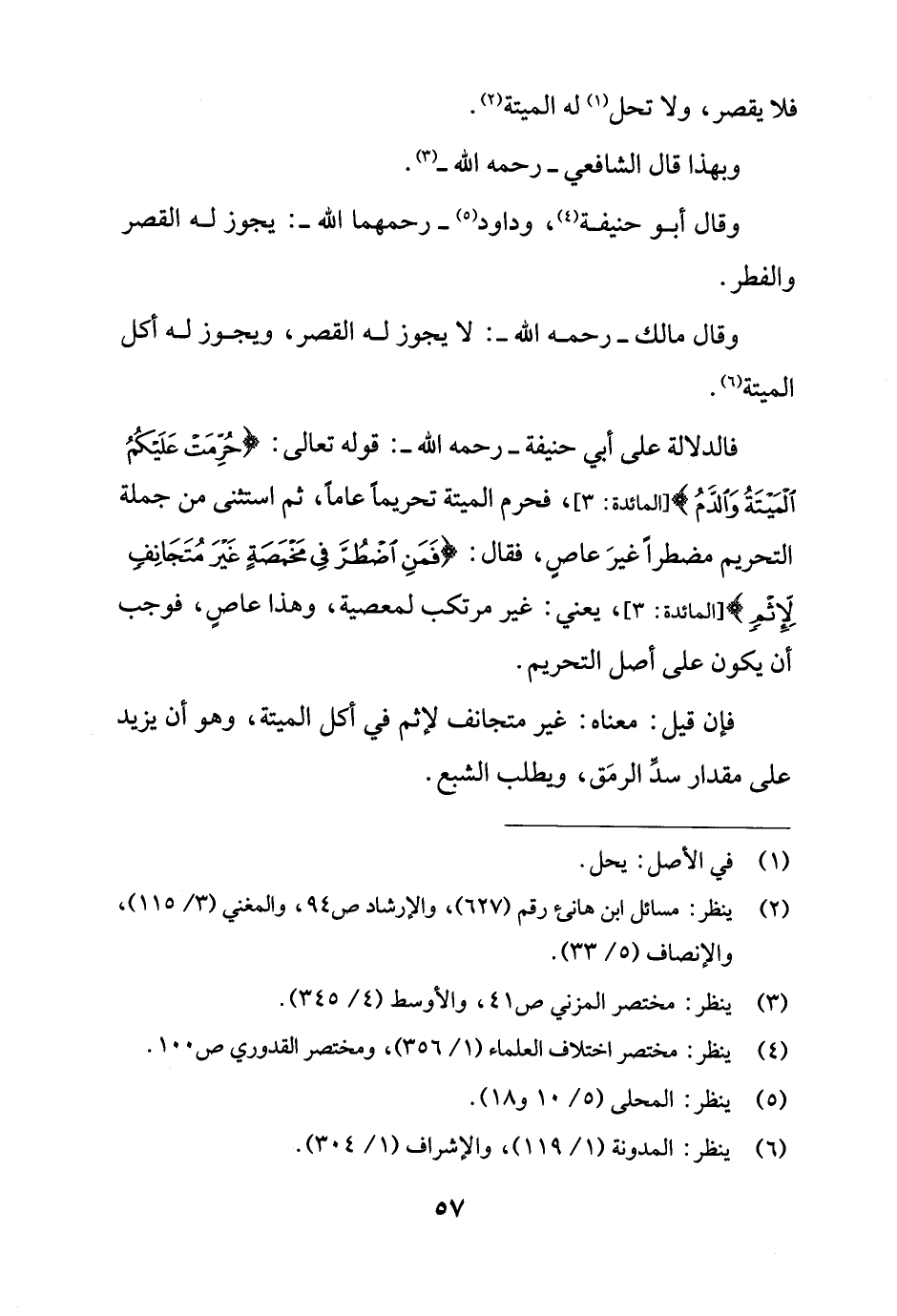 فالدلالة على أبي حنيفة - رحمه الله -: قوله تعالى: {حُرِّمَتْ عَلَيْكُمُ الْمَيْتَةُ وَالدَّمُ} [المائدة: 3]، فحرم الميتة تحريمًا عامًا، ثم استثنى من جملة التحريم مضطرًا غيرَ عاصٍ، فقال: {فَمَنِ اضْطُرَّ فِي مَخْمَصَةٍ غَيْرَ مُتَجَانِفٍ لِإِثْمٍ} [المائدة: 3]، يعني: غير مرتكب لمعصية، وهذا عاصٍ، فوجب أن يكون على أصل التحريم.