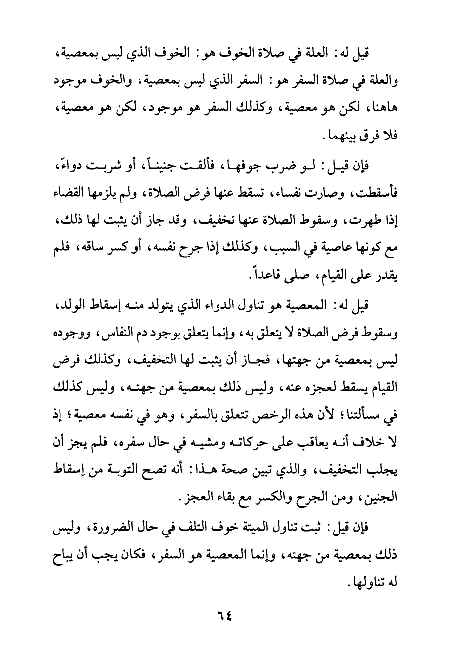 قيل له: المعصية هو تناول الدواء الذي يتولد منه إسقاط الولد، وسقوط فرض الصلاة لا يتعلق به، وإنما يتعلق بوجود دم النفاس، ووجوده ليس بمعصية من جهتها، فجاز أن يثبت لها التخفيف، وكذلك فرض القيام يسقط لعجزه عنه، وليس ذلك بمعصية من جهته، وليس كذلك في مسألتنا؛ لأن هذه الرخص تتعلق بالسفر، وهو في نفسه معصية؛ إذ لا خلاف أنه يعاقب على حركاته ومشيه في حال سفره، فلم يجز أن يجلب التخفيف، والذي تبين صحة هذا: أنه تصح التوبة من إسقاط الجنين، ومن الجرح والكسر مع بقاء العجز.