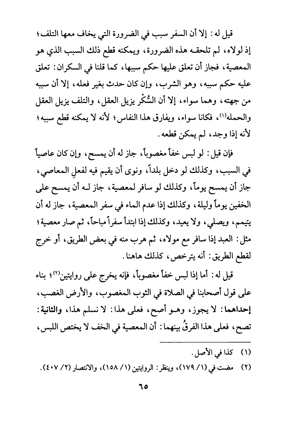 فإن قيل: لو لبس خفًا مغصوبًا، جاز له أن يمسح، وإن كان عاصيًا في السبب، وكذلك لو دخل بلدًا، ونوى أن يقيم فيه لفعلِ المعاصي، جاز أن يمسح يومًا، وكذلك لو سافر لمعصية، جاز له أن يمسح على الخفين يومًا وليلة، وكذلك إذا عدم الماء في سفر المعصية، جاز له أن يتيمم، ويصلي، ولا يعيد، وكذلك إذا ابتدأ سفرًا مباحًا، ثم صار معصية؛ مثل: العبد إذا سافر مع مولاه، ثم هرب منه في بعض الطريق، أو خرج لقطع الطريق: أنه يترخص، كذلك ها هنا.