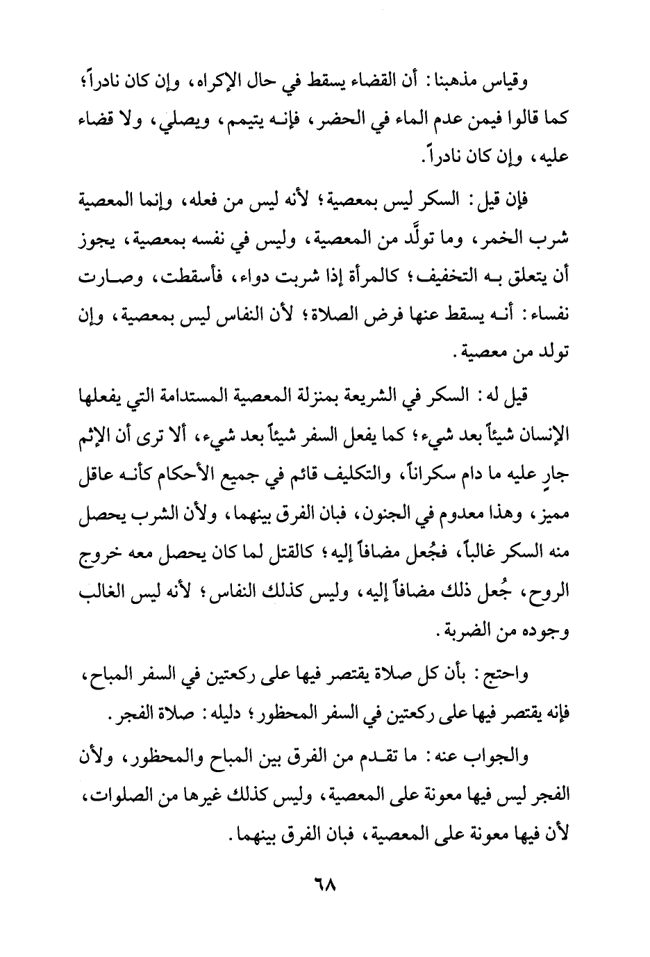 فإن قيل: السكر ليس بمعصية؛ لأنه ليس من فعله، وإنما المعصية شرب الخمر، وما تولَّد من المعصية، وليس في نفسه بمعصية، يجوز أن يتعلق به التخفيف؛ كالمرأة إذا شربت دواء، فأسقطت، وصارت نفساء: أنه يسقط عنها فرض الصلاة؛ لأن النفاس ليس بمعصية، وإن تولد من معصية.