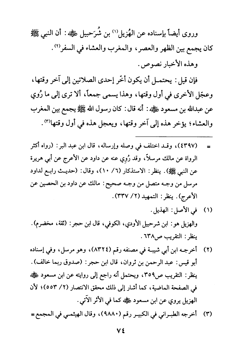 وروى أيضًا بإسناده عن الهُزيل (¬1) بن شُرَحبيل - رضي الله عنه -: أن النبي - صلى الله عليه وسلم - كان يجمع بين الظهر والعصر، والمغرب والعشاء في السفر (¬2).