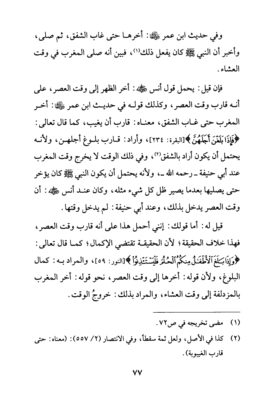 فإن قيل: يحمل قول أنس - رضي الله عنه -: أخر الظهر إلى وقت العصر، على أنه قارب وقت العصر، وكذلك قوله في حديث ابن عمر - رضي الله عنهما -: أخر المغرب حتى غاب الشفق، معناه: قارب أن يغيب، كما قال تعالى: {فَإِذَا بَلَغْنَ أَجَلَهُنَّ} [البقرة: 234]، وأراد: قارب بلوغ أجلهن، ولأنه يحتمل أن يكون أراد بالشفق (¬2)، وفي ذلك الوقت لا يخرج وقت المغرب عند أبي حنيفة - رحمه الله -، ولأنه يحتمل أن يكون النبي - صلى الله عليه وسلم - كان يؤخر حتى يصليها بعد ما يصير ظل كل شيء مثله، وكان عند أنس - رضي الله عنه -: أن وقت العصر يدخل بذلك، وعند أبي حنيفة: لم يدخل وقتها.