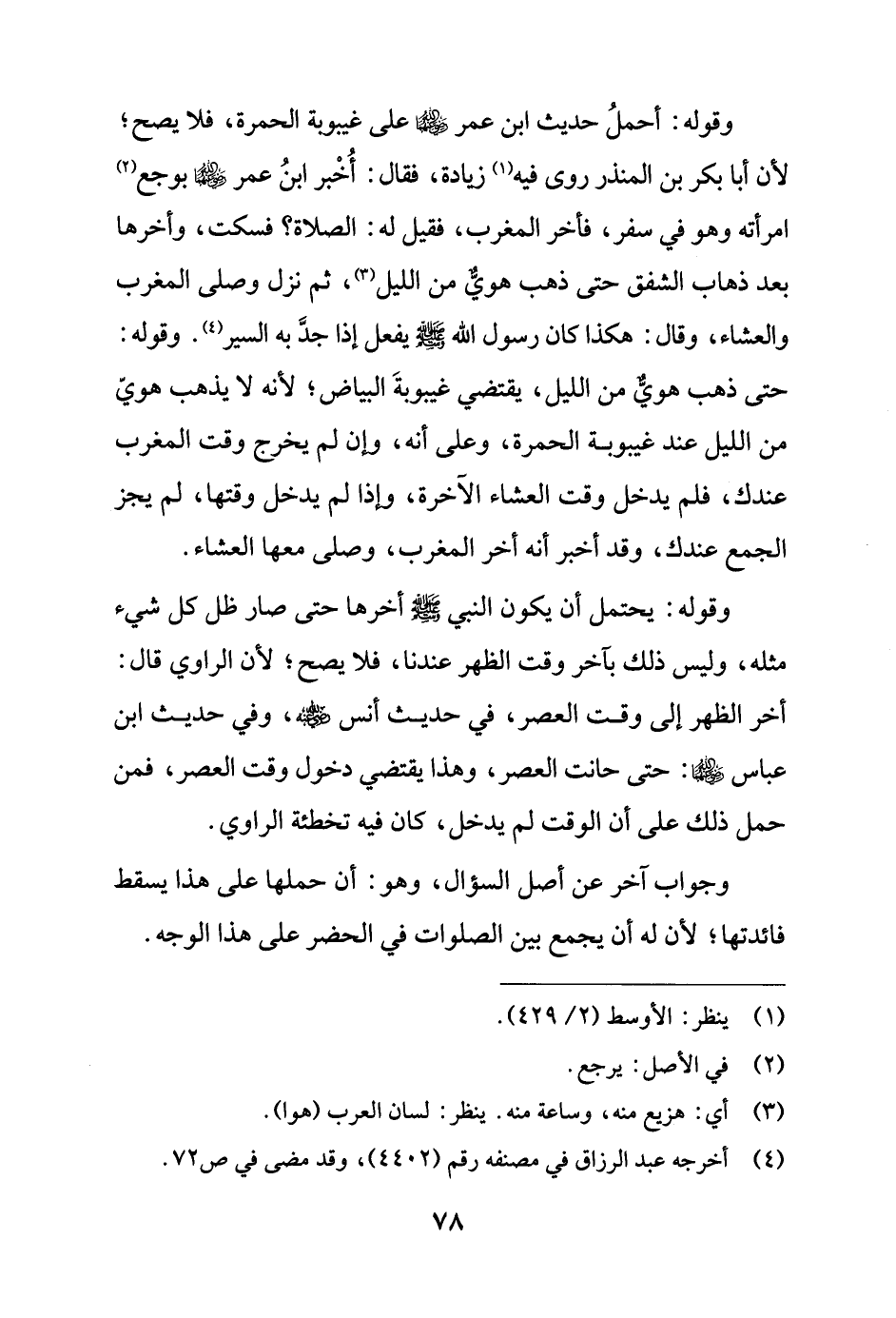 وقوله: أحملُ حديث ابن عمر - رضي الله عنهما - على غيبوبة الحمرة، فلا يصح؛ لأن أبا بكر بن المنذر روى فيه (¬1) زيادة، فقال: أُخْبر ابنُ عمر - رضي الله عنهما - بوجع (¬2) امرأته وهو في سفر، فأخر المغرب، فقيل له: الصلاة؟ فسكت، وأخرها بعد ذهاب الشفق حتى ذهب هويٌّ من الليل (¬3)، ثم نزل وصلى المغرب والعشاء، وقال: هكذا كان رسول الله - صلى الله عليه وسلم - يفعل إذا جدَّ به السير (¬4). وقوله: حتى ذهب هويٌّ من الليل، يقتضي غيبوبةَ البياض؛ لأنه لا يذهب هويّ من الليل عند غيبوبة الحمرة، وعلى أنه، وإن لم يخرج وقت المغرب عندك، فلم يدخل وقت العشاء الآخرة، وإذا لم يدخل وقتها، لم يجز الجمع عندك، وقد أخبر أنه أخر المغرب، وصلى معها العشاء.